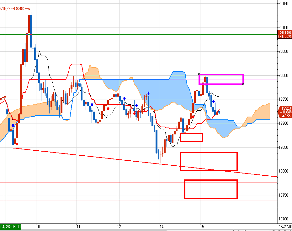첫번째 빨간색 박스구간 19880에 매수 1개 진입하였다.