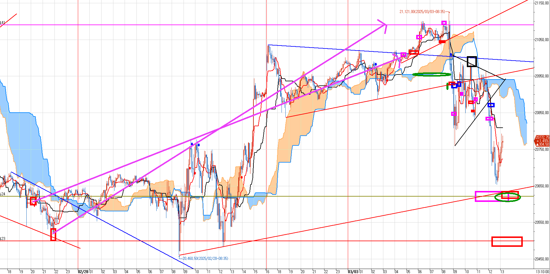 금요일 오전에 밑바닥에서 잡은 왼쪽 빨간박스 두 구간은 어젯밤 윗 분홍선에 홀딩분 올청하였다.