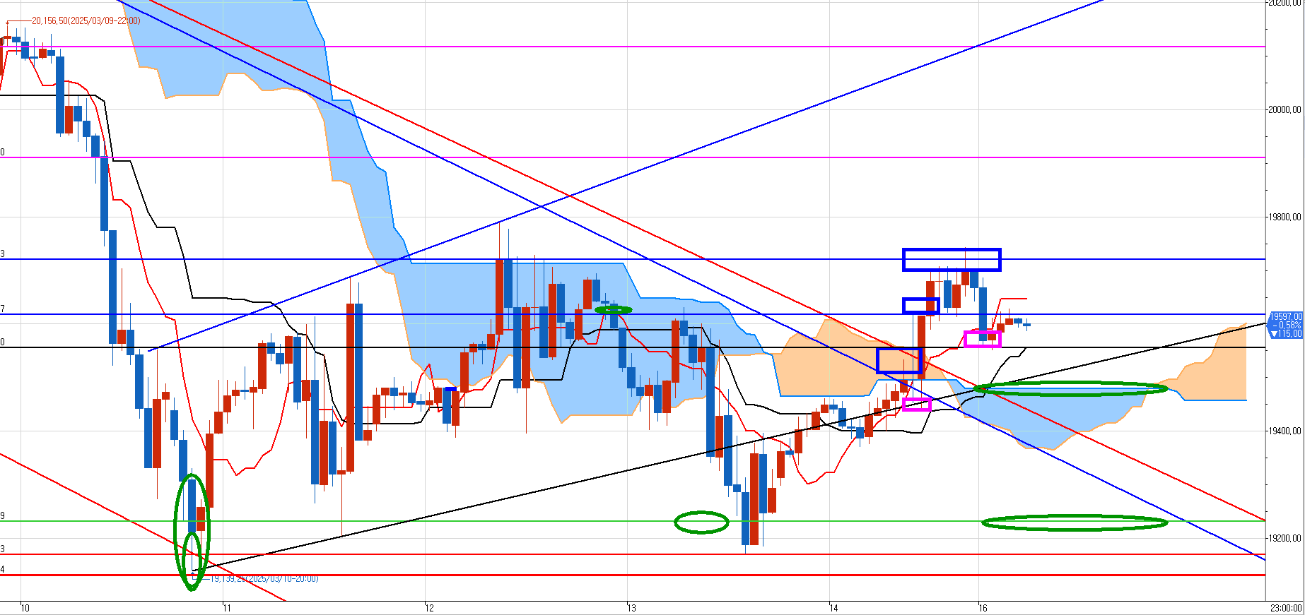 그리고 다시 쳐 올라오는 것을 윗 두 구간에서 분할 매도 진입하여 원래는 초록색 동그라미 부근의 매도 목표가를 노렸으나.. 금요일 밤에 찍지 않았고,