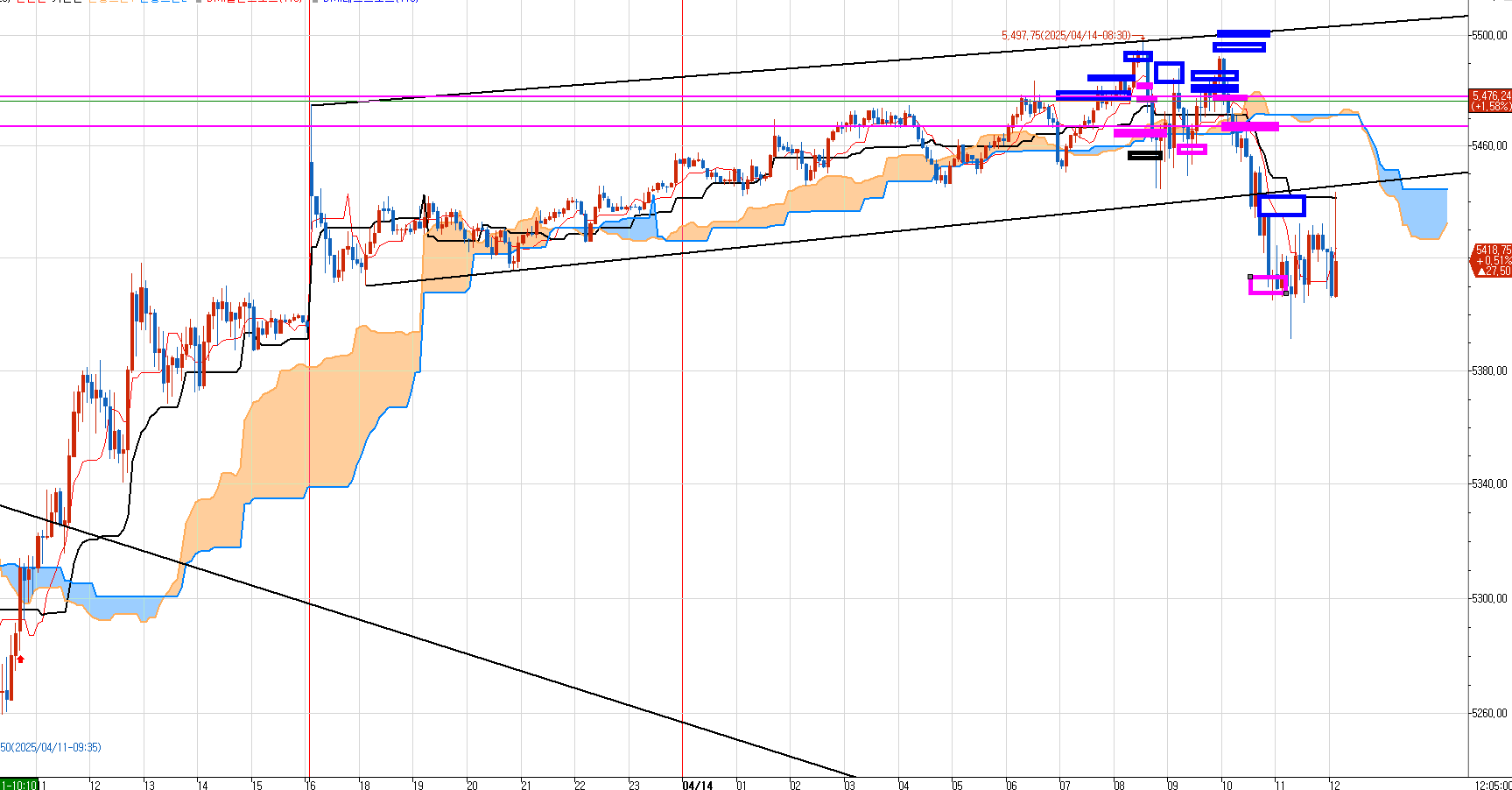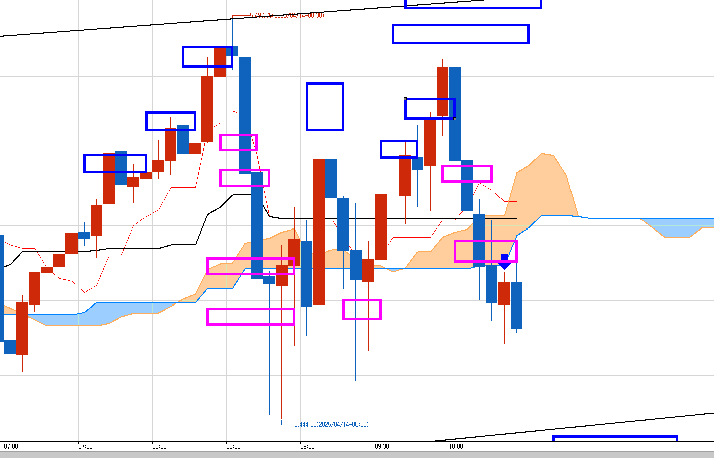 파란박스마다 매도 진입하여 분홍박스에 먹튀하면서 마지막 1개는 최종 도 목표가에 청산했다.