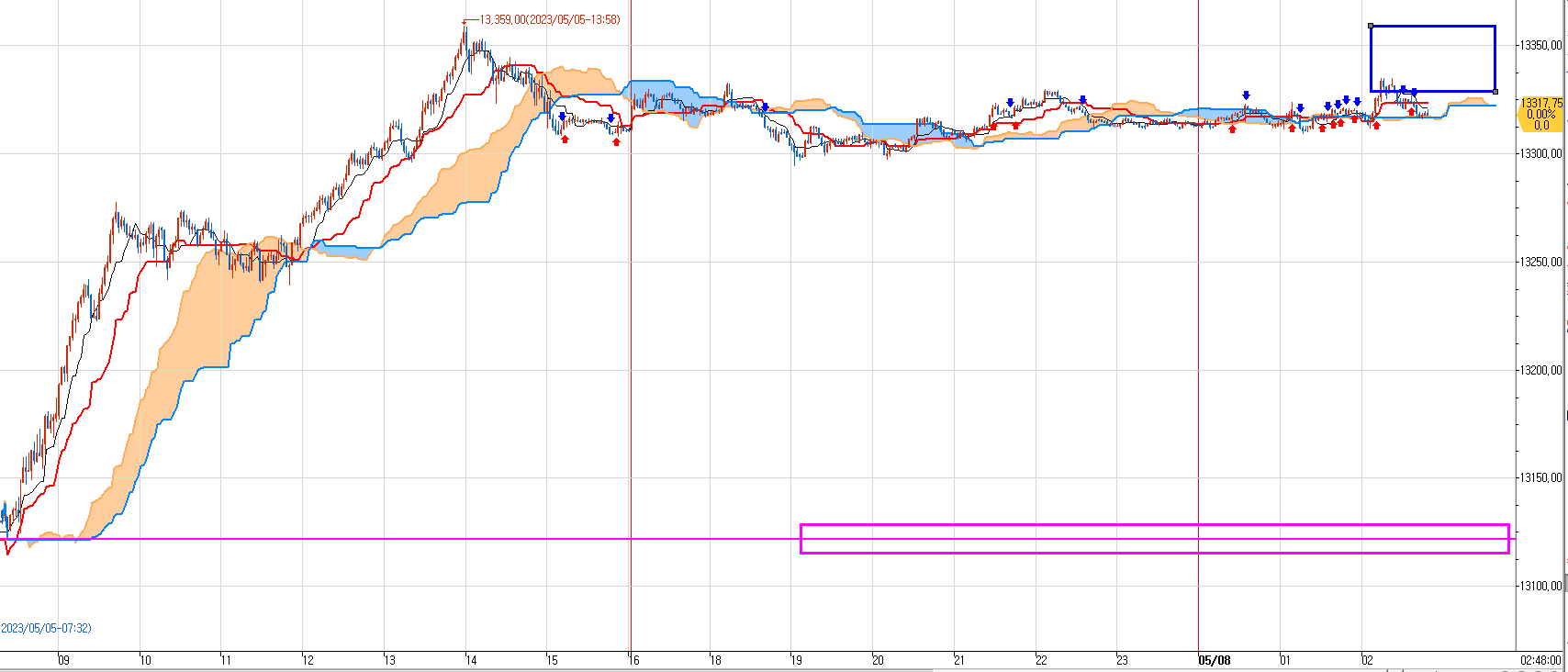 5월8일 해외선물 나스닥 일목균형표 차트 2분봉에 매도 목표가 발생하였다.