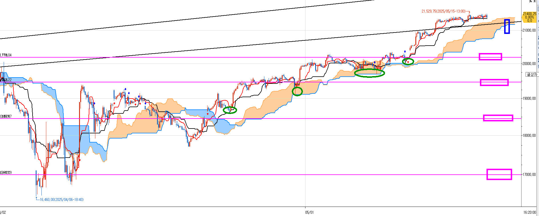 4월24일 반등이 시작된 첫번째 초록색 동그라미 부근 이후로 100분봉 양운을 깬적이 없다.