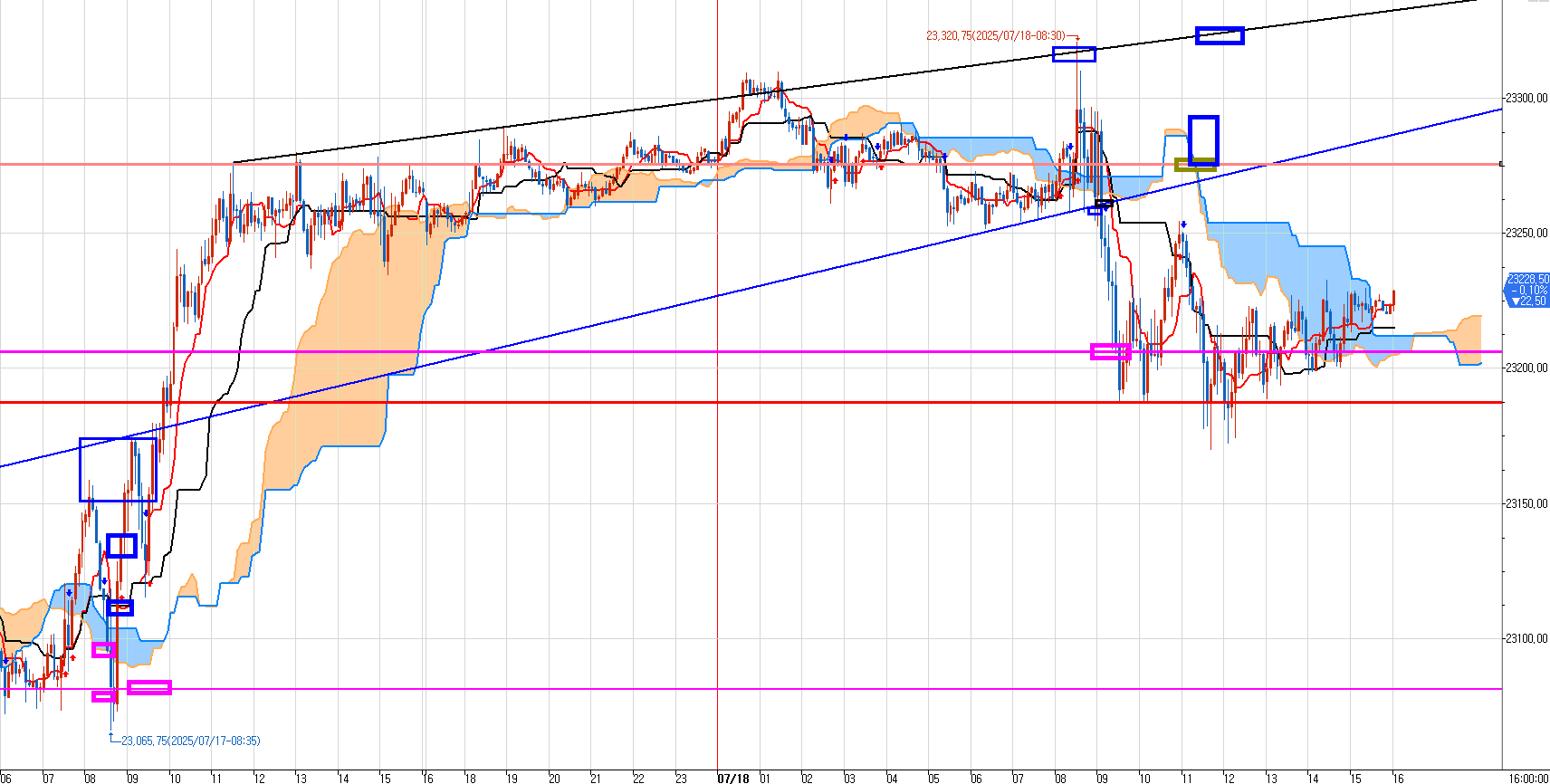 어젯밤 미장 시작하면서 추가로 잡은 매도는 아래 분홍박스에 던지고