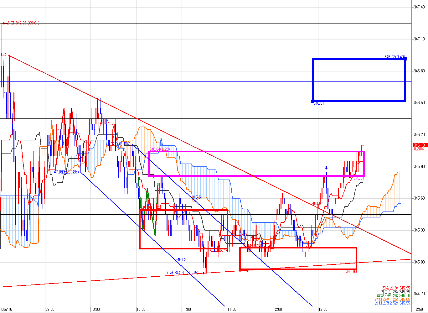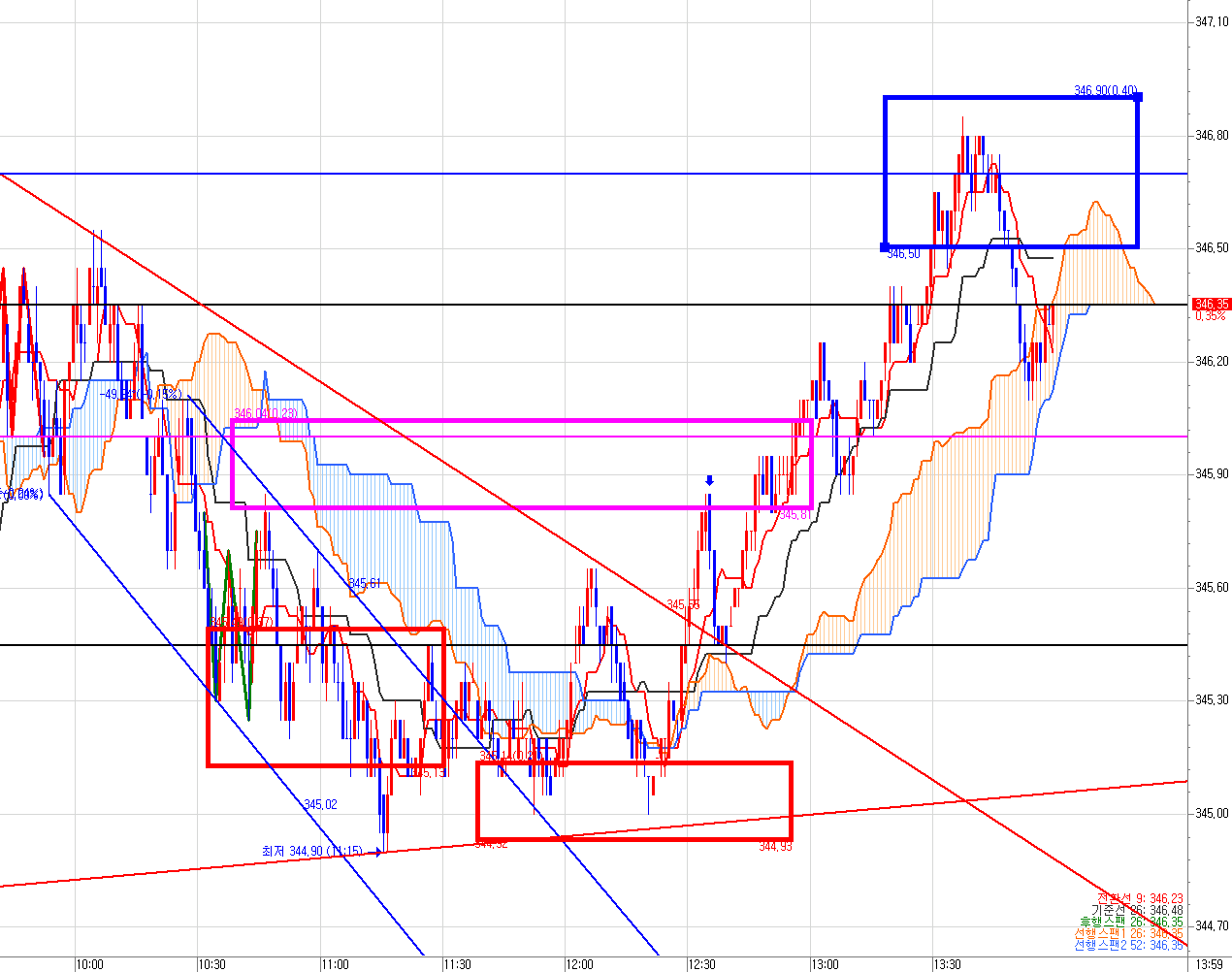 345.30 매도 목표가는 일목균형표 220틱 차트에서 발생했다. 분홍색 박스 구간이다.