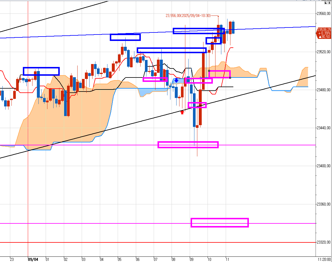 일목중생분들도 왓츠앱 문자 리딩에 따라서 왼쪽 파란박스 2개 구간에 분할 매도 진입했다.
