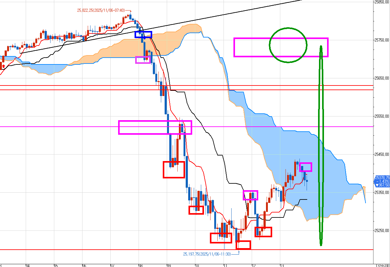 중간에 있는 큰 분홍색 박스(초록색 동그라미)가 수요일에 발생한 매도 목표가 였다.
