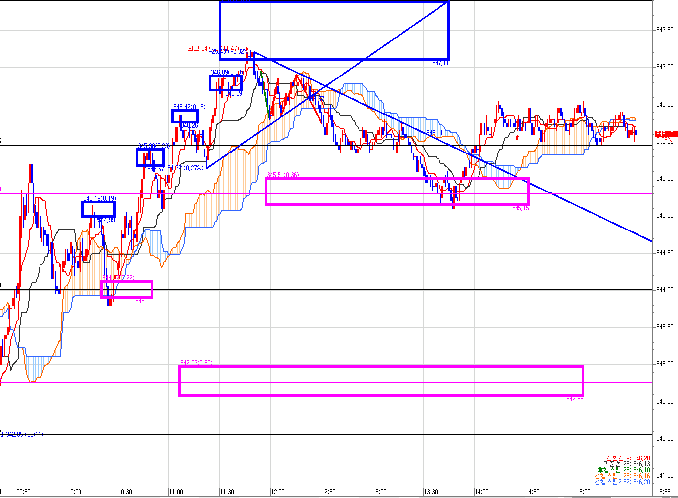 1차 목표가 345.30 근처에 쭉 팔아 먹으면서 내려왔다.