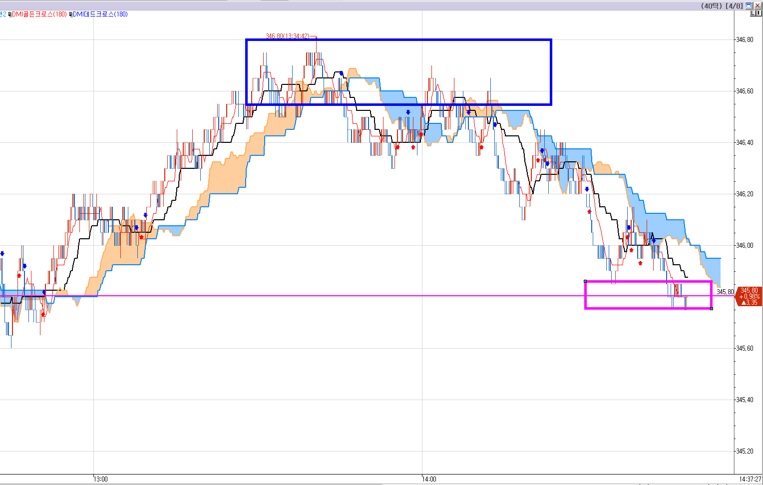 오후에 발생한 40틱 차트에서 매도 목표가 345.80 (분홍색 구간)