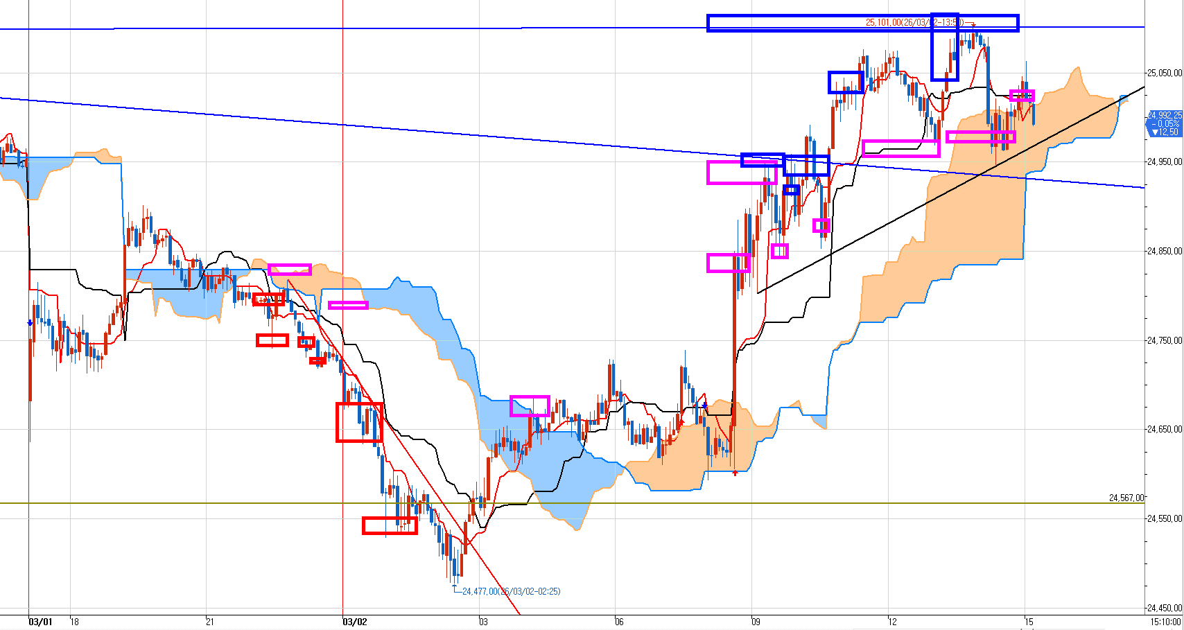 3차까지 분할 매수 진입하지만 아래 60분봉 지지선 24530이 깨지면 손절은 안하고 잠시 관망한다.