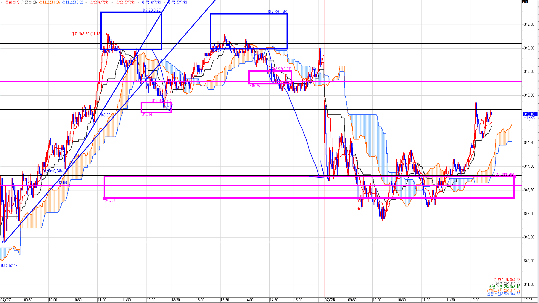 위 차트는 코스피200 선물 1분봉 7월27일부터 오늘 오전까지 차트다.