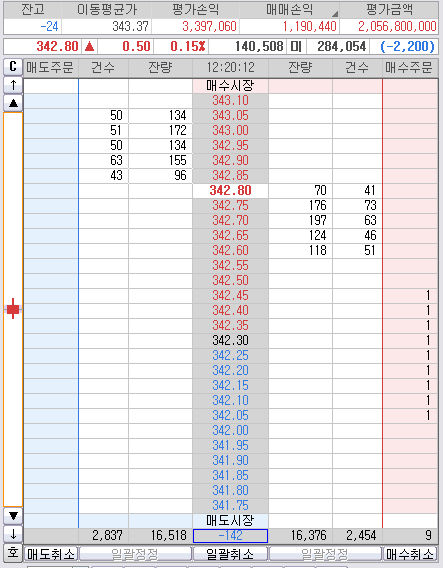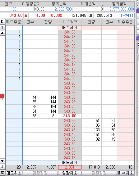 오늘 오전에 이미 매도 목표가 발생했다. 340.80이 매도 목표가다. (분홍박스 구간)