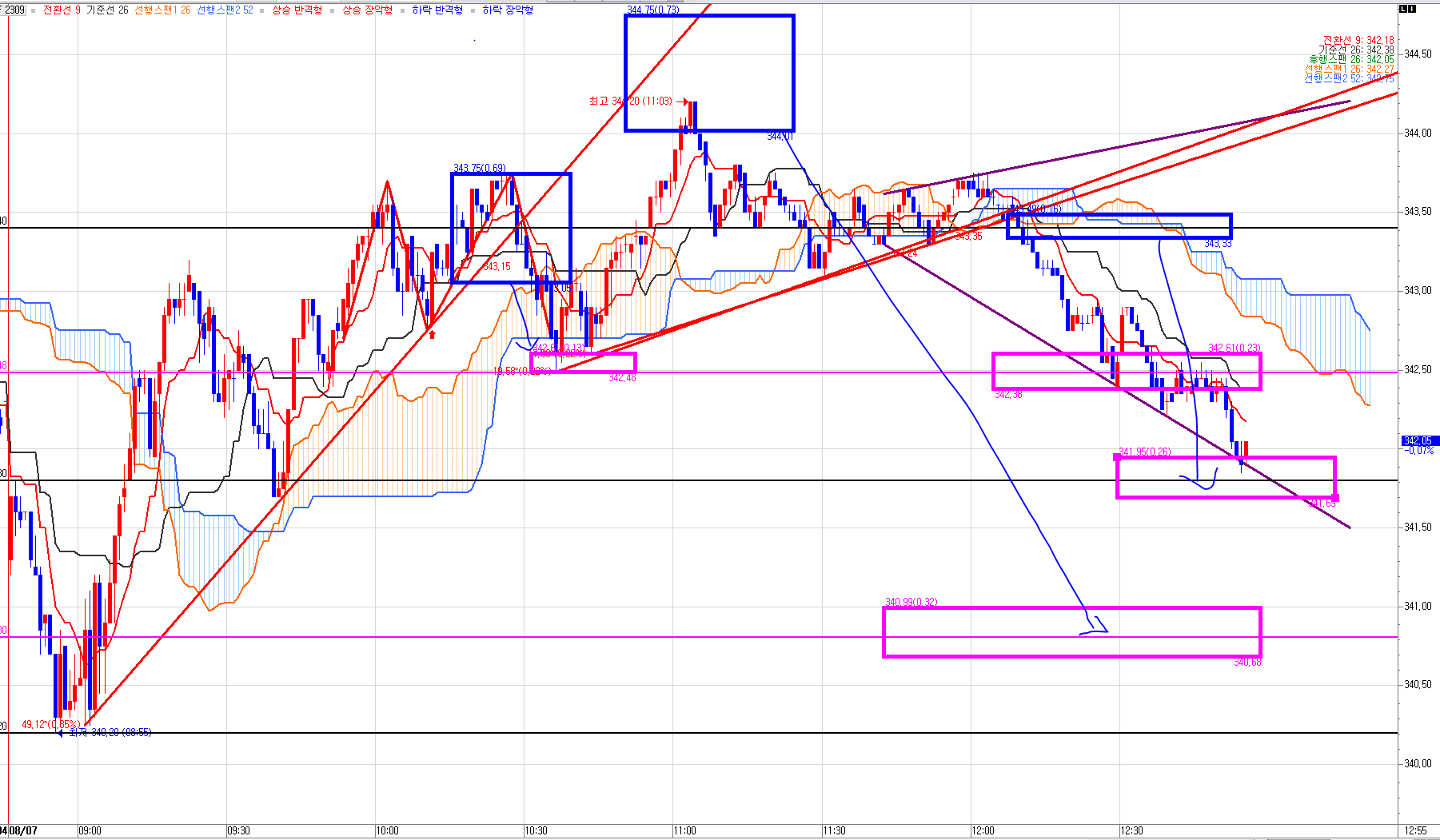8월물 콜옵션 340 3분봉에도 매도 목표가 발생했다.