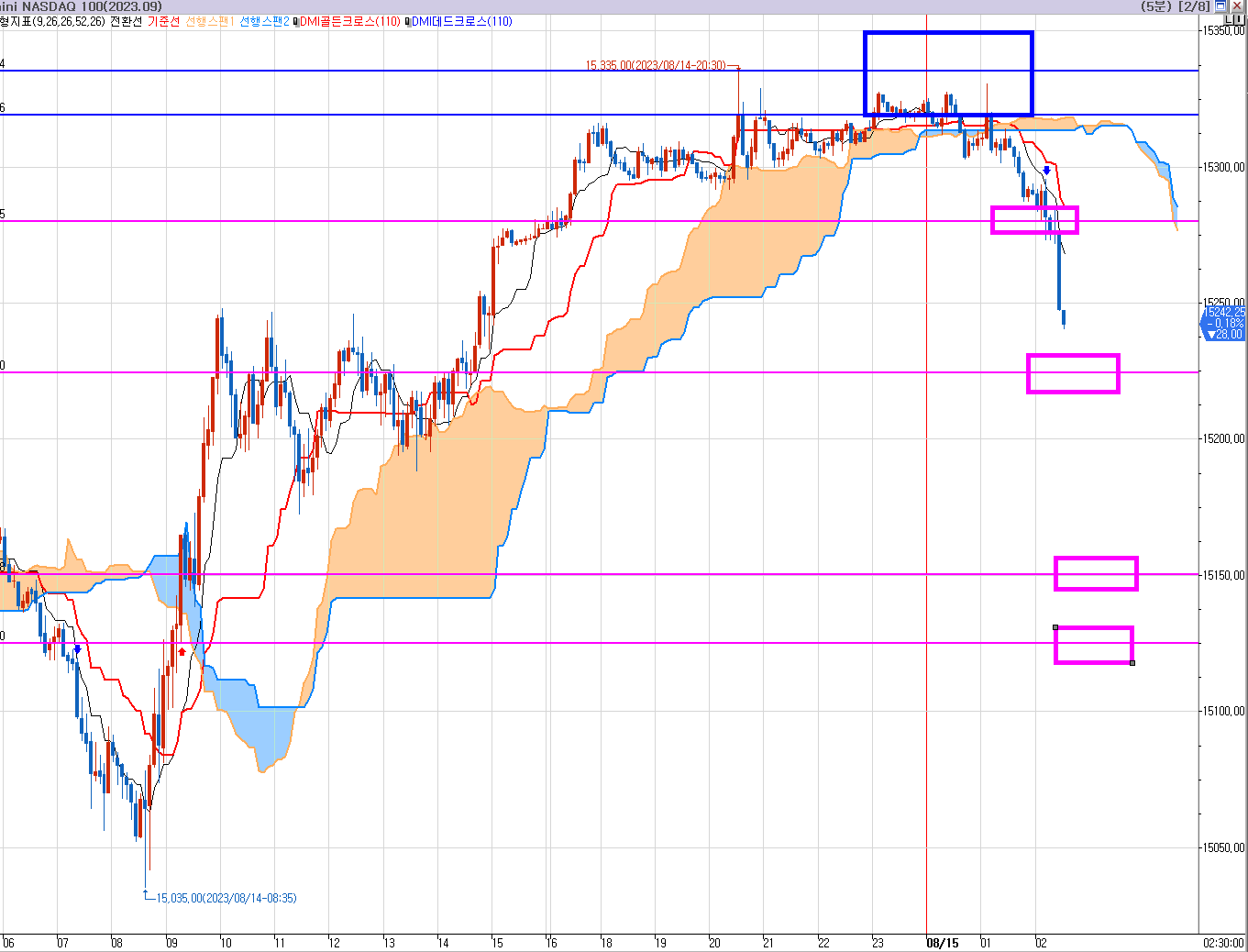 오늘 일목균형표는 나스닥 선물, S&P 500 선물 모두 한참 저 밑에 매도 목표가가 발생함.