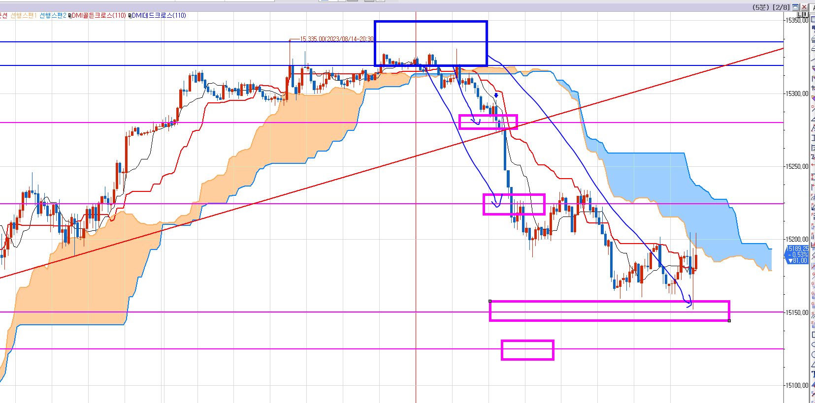 오늘 일목균형표 75틱에서 이미 발생한 3차 매도목표가 15150 보다 3포 위에 청산 한 것이다.