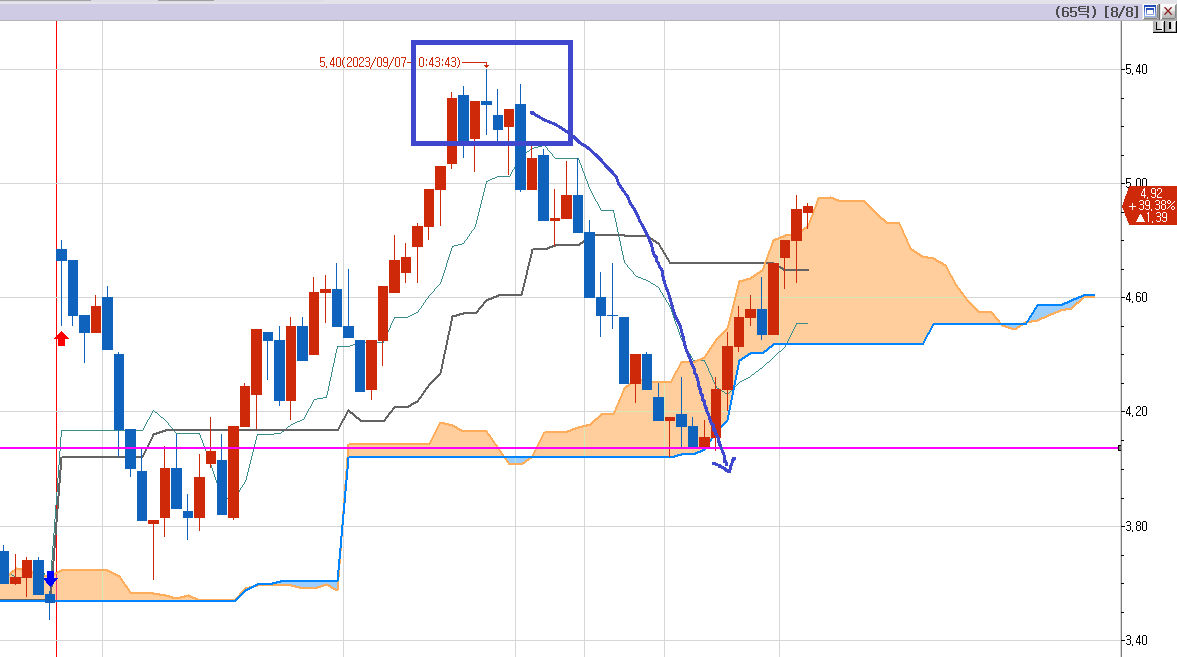 5분봉에서도 20만원짜리 풋옵션이 15만원까지 빠진다고 이미 일목균형표는 오늘 오전부터 알려주고 있었다.