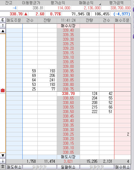 지켜보니 음틱으로 찍고 바로 339.05 선 깨지는 것 보면서 시장가로 몇개 따라 잡고 나머진 그냥 쭉~ 매도 대어 놓았다.