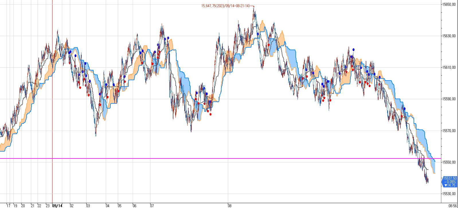 분홍색선이 15553.00 이다.