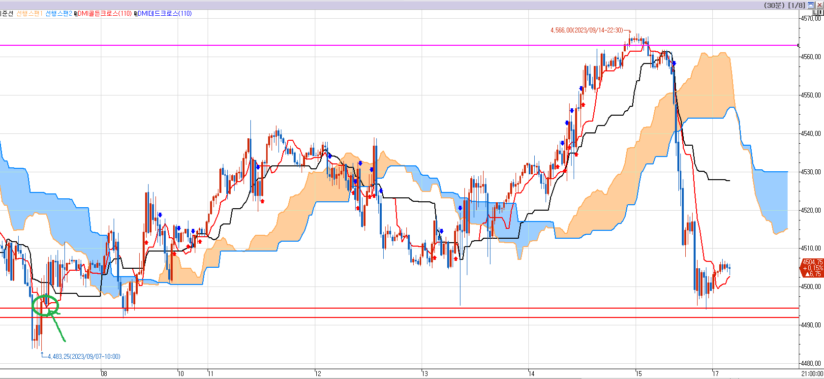 9월8일에 그 부분을 지지 받고 상승 하였고 일목균형표는 차트에 흔적을 남긴 것이다.