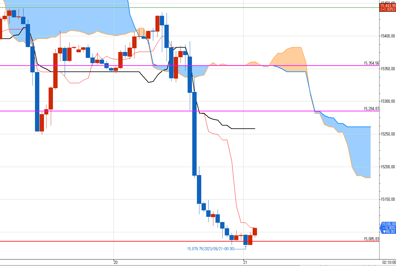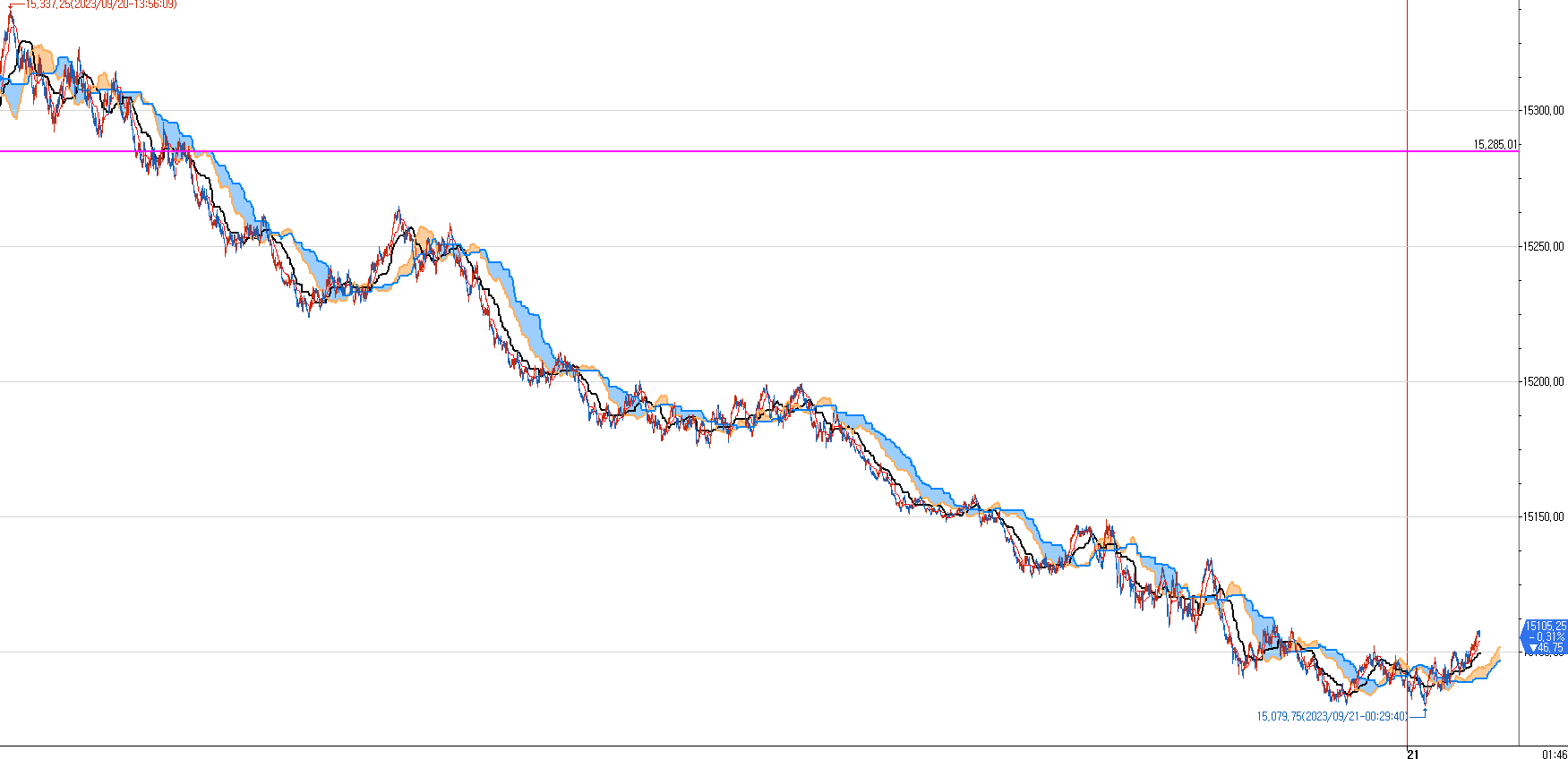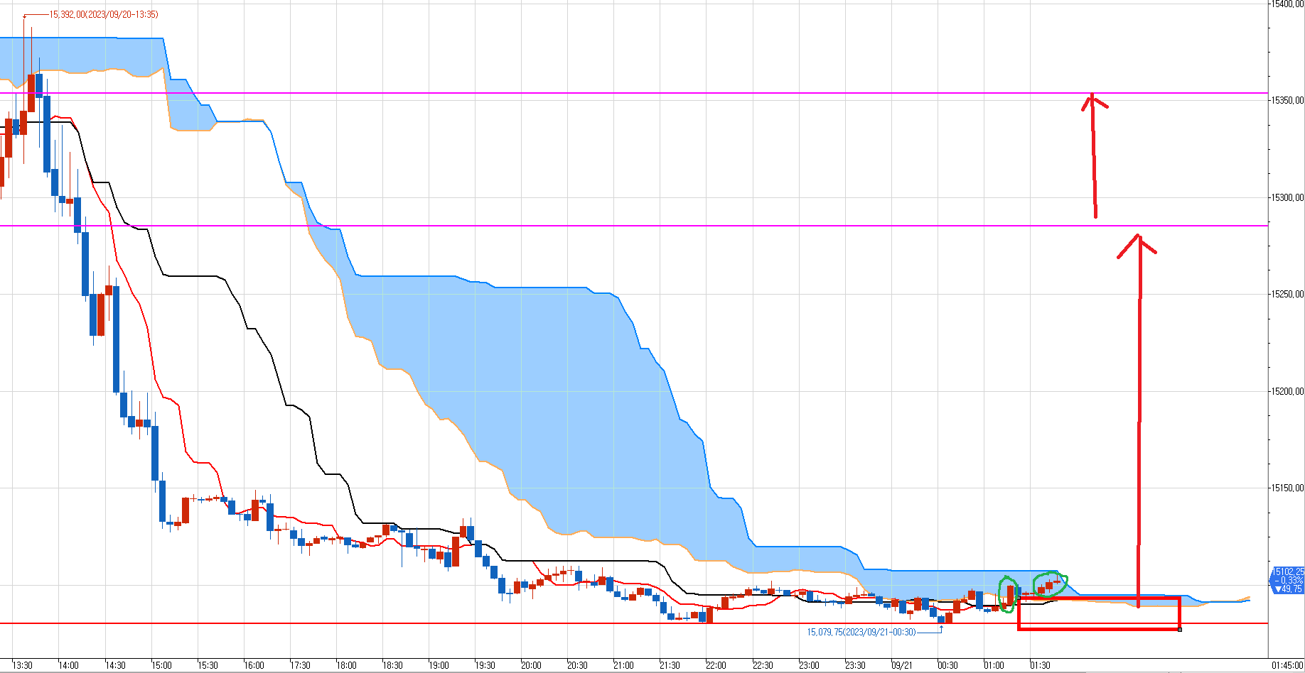 일목균형표 50분봉상 첫번째 지지선(기준선 수평선) 15085를 지지 받고 있는 모습이다.