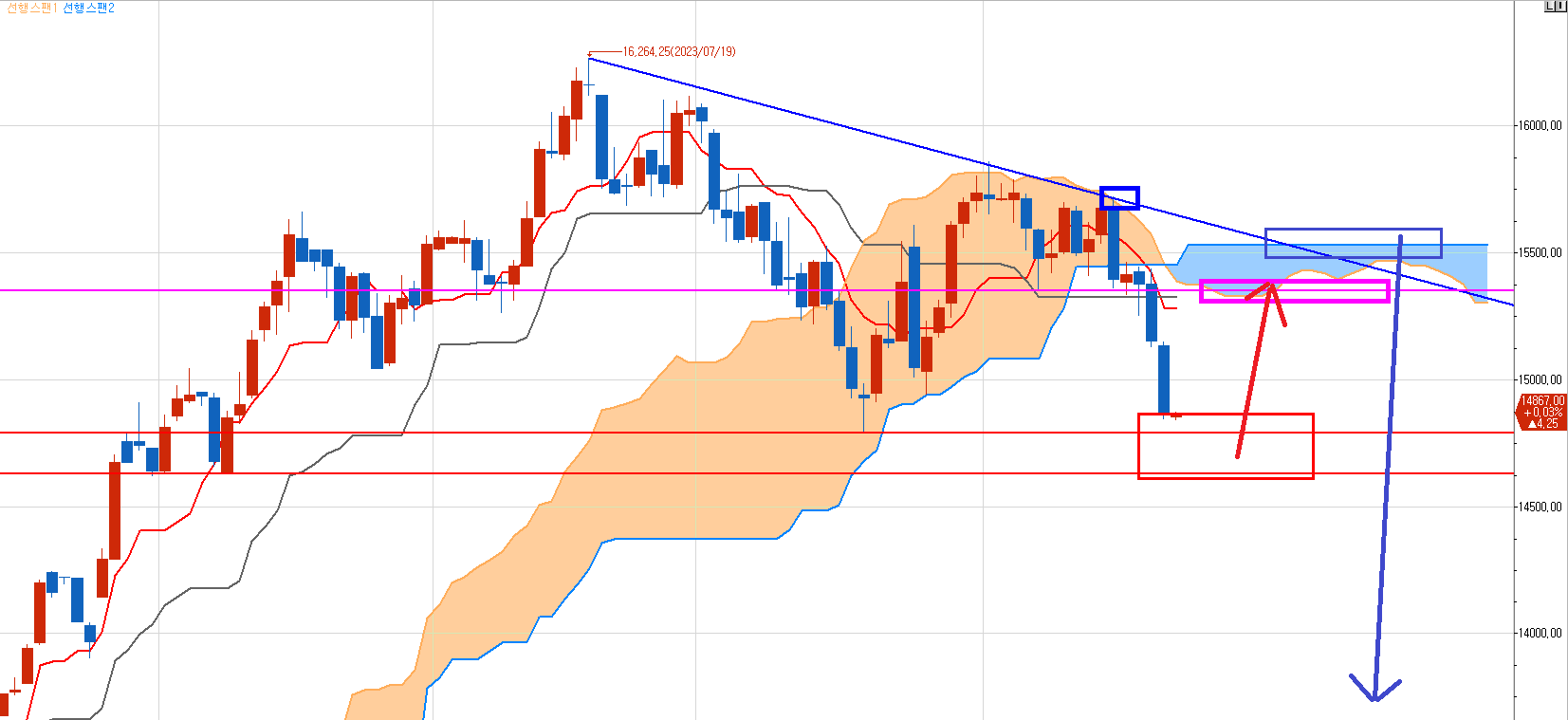 마지막 1개는 분홍색 박스 최종 매수 목표가 15350까지 들고 갈 것이다.