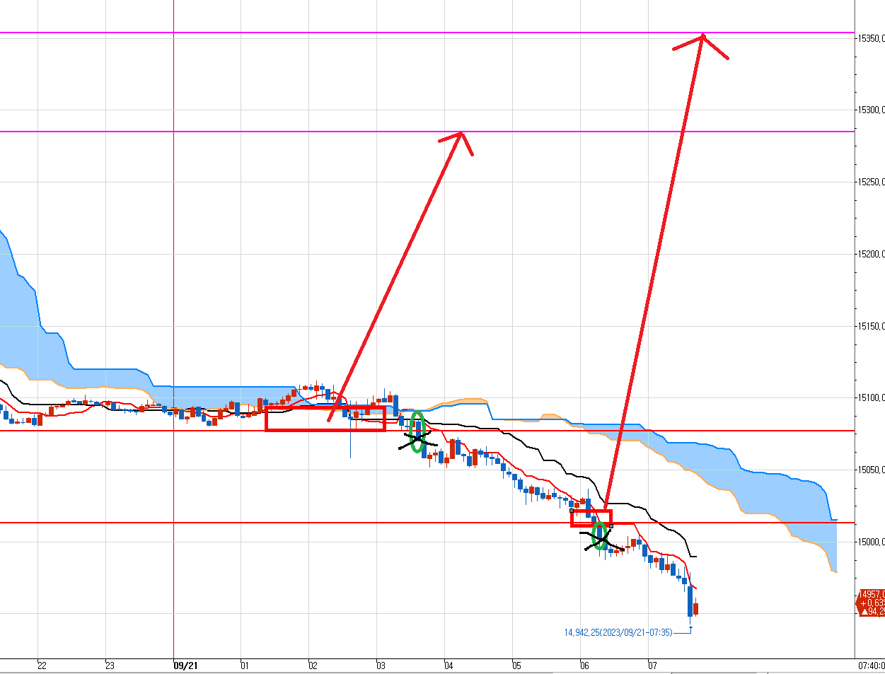 어제 78번 글에서 매수 목표가 15280 과 15350 먹기 위해서 첫번째 빨간 박스에서 매수 진입했다고 했다.