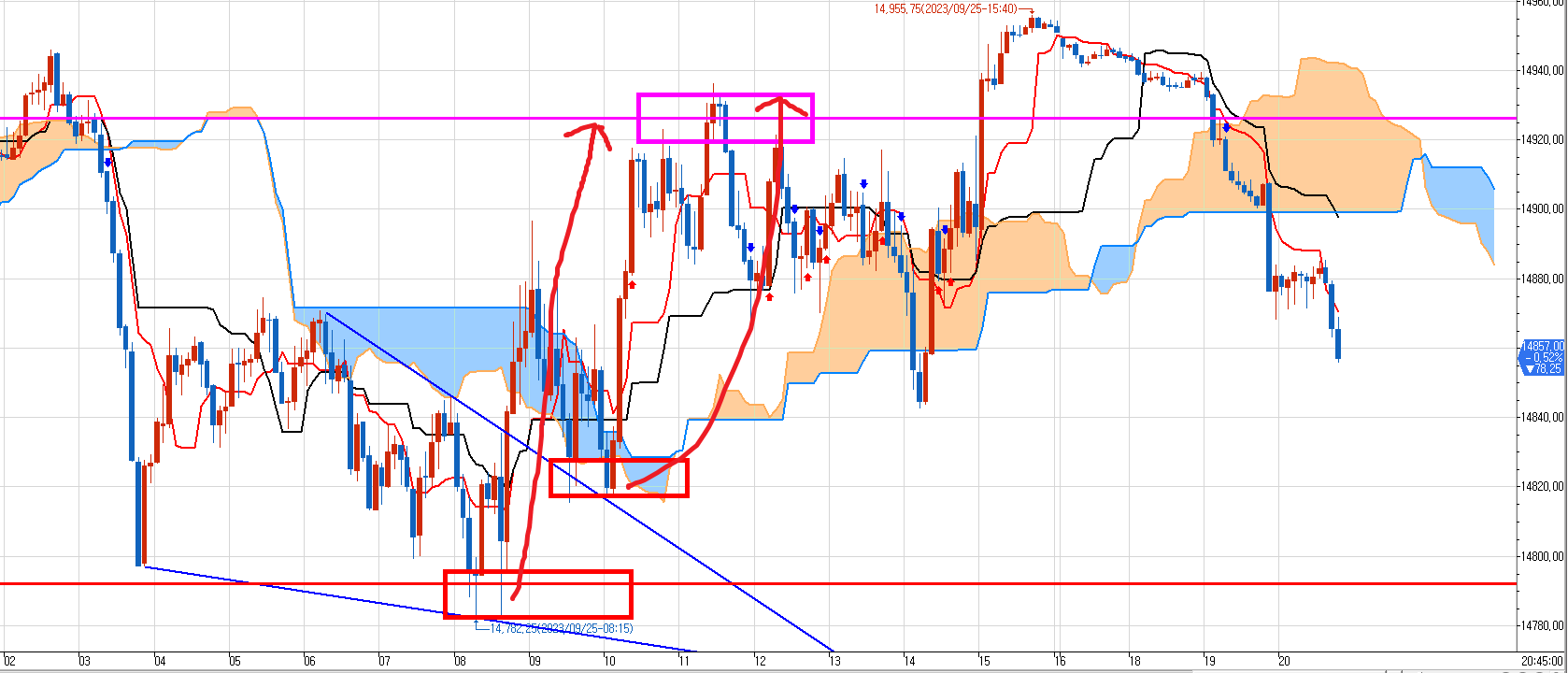 밑 빨간색선이 일봉상 1차 지지선이다. 14792.00