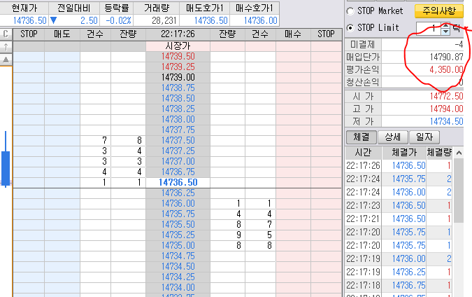 나스닥 매매창 이다. 어젯밤 매도 진입한것 아직 홀딩 중이다.