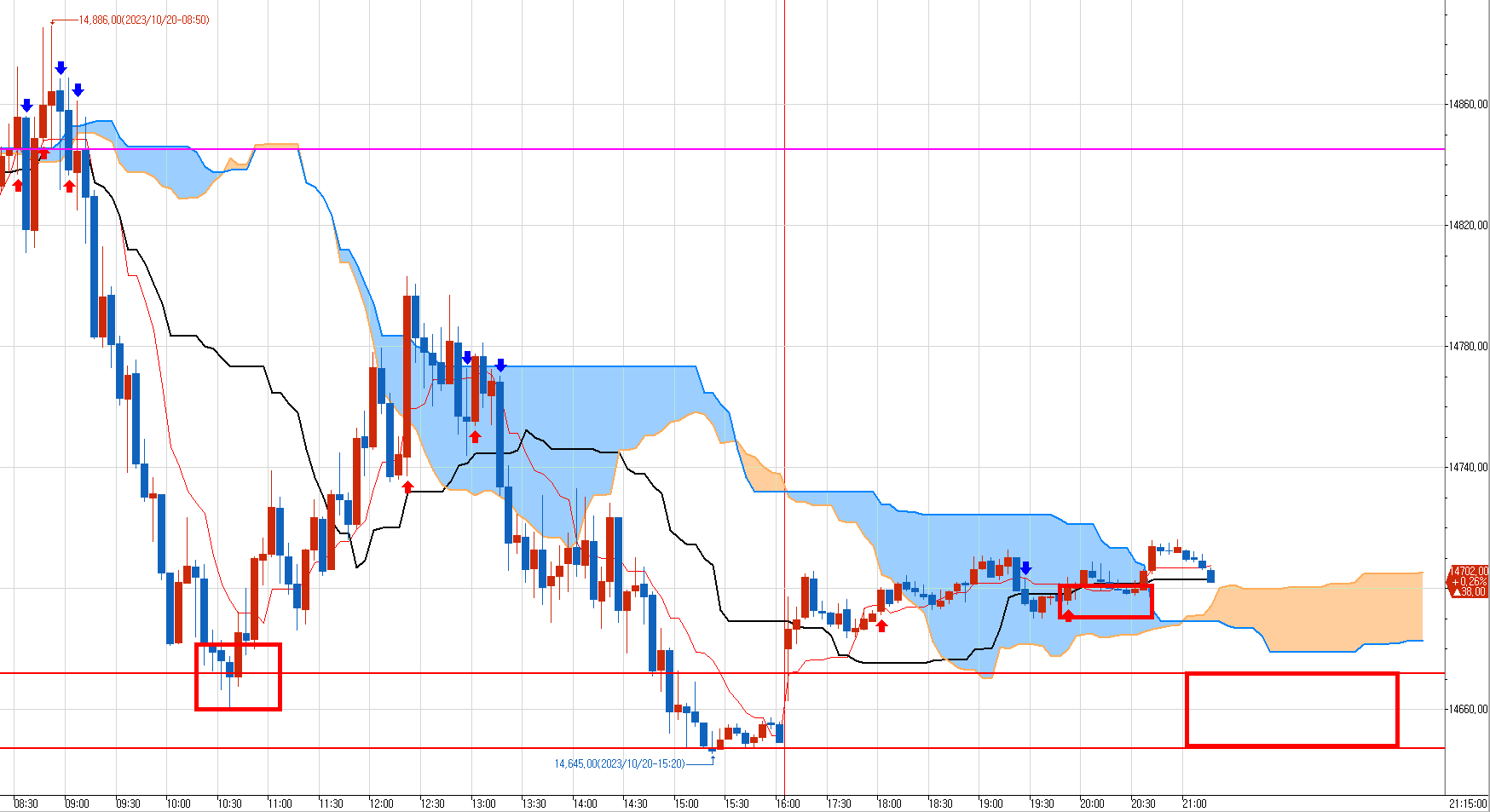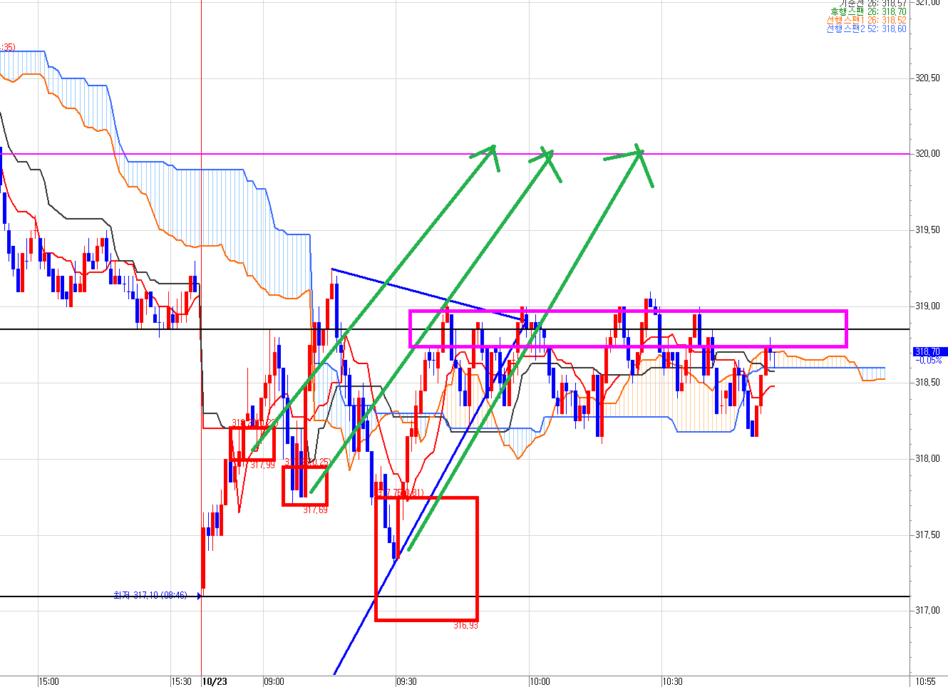 10월23일 국내선물 1분봉이다.