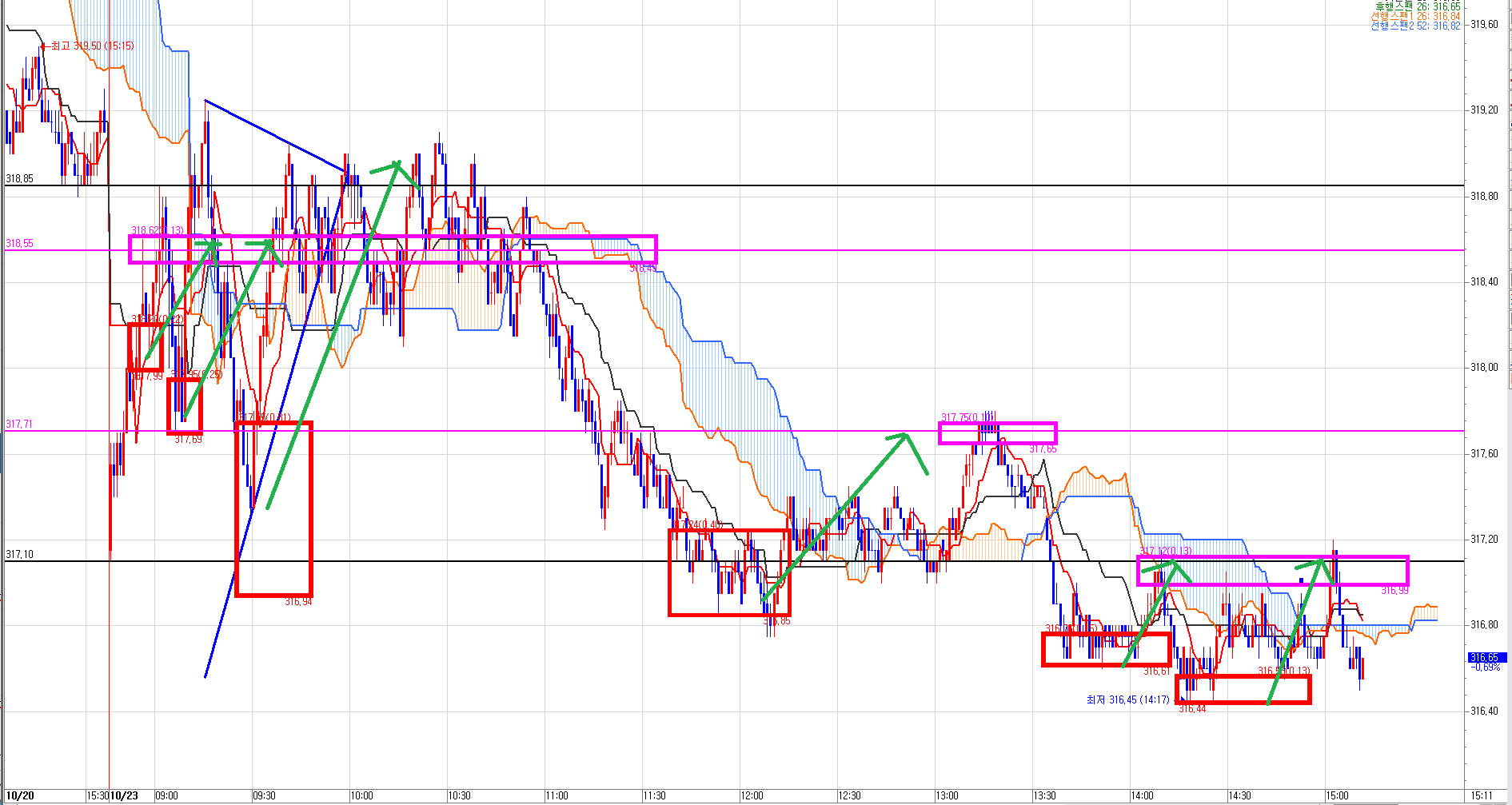 시초부터 빨간박스 마다 매수 들어가서 분홍박스에 분할 수익청산 하였다.