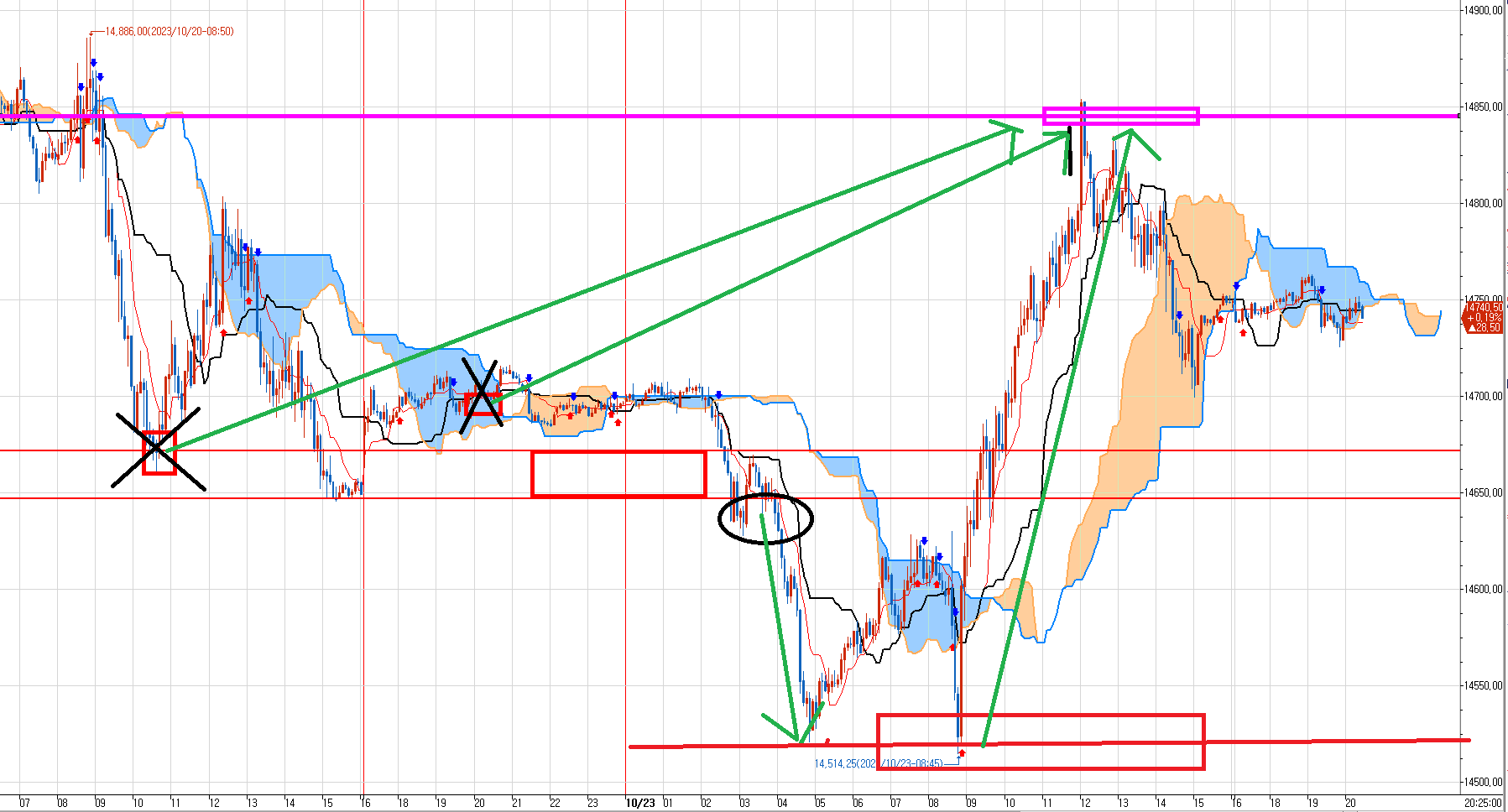 X표시한 이유는 그곳에서 매수한것은 14845 안 찍고 지지선 깨지고 왕창 더 떨어졌기 때문이다.