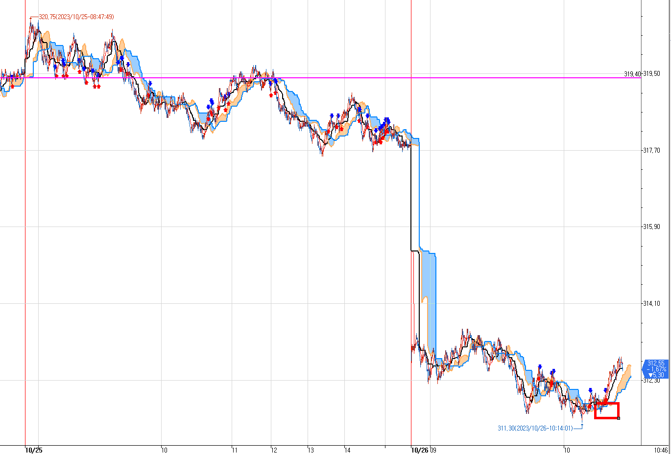100틱 차트에서 어제 발생한 매수 목표가다 정확히는 319.40!!!