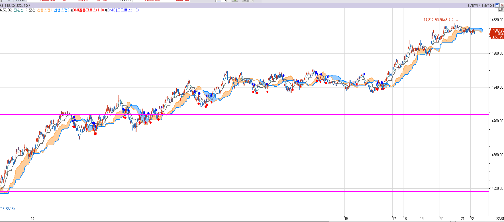 14707도달시 80% 이상 청산할 것이고, 1~2개만 2차 매도 목표가 14615까지 가져가 볼 것이다.