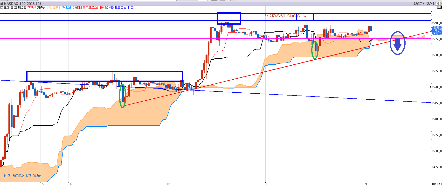 초록색 동그라미 표시한 것이 일목균형표 30분봉 양운에 장대 음봉을 박았었다.