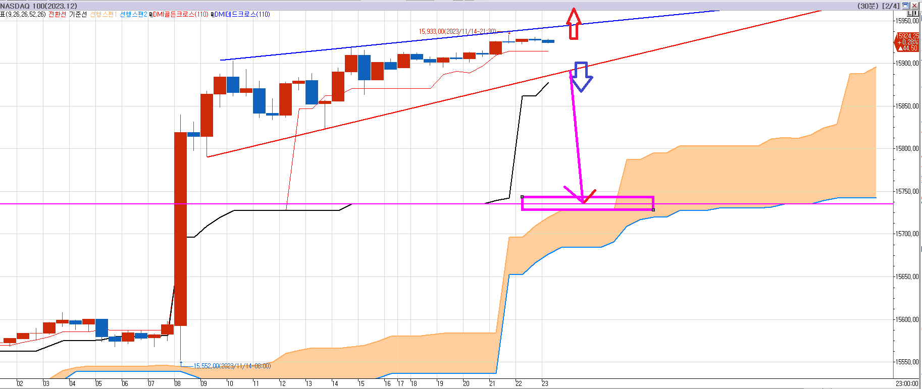 언젠가는 나스닥 30분봉이 기준선 찍으로 분홍색 박스까지 내려 올 것이다.