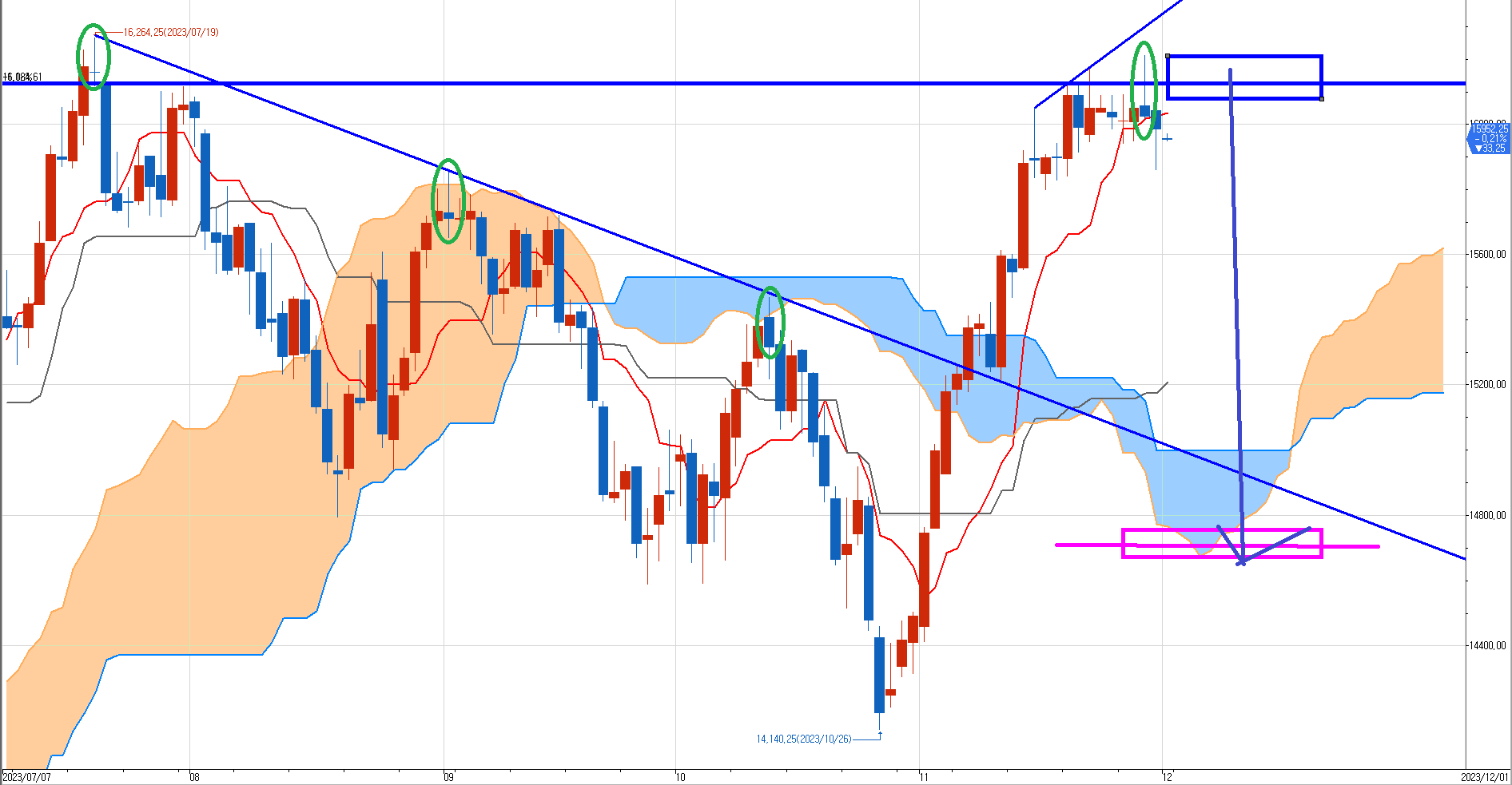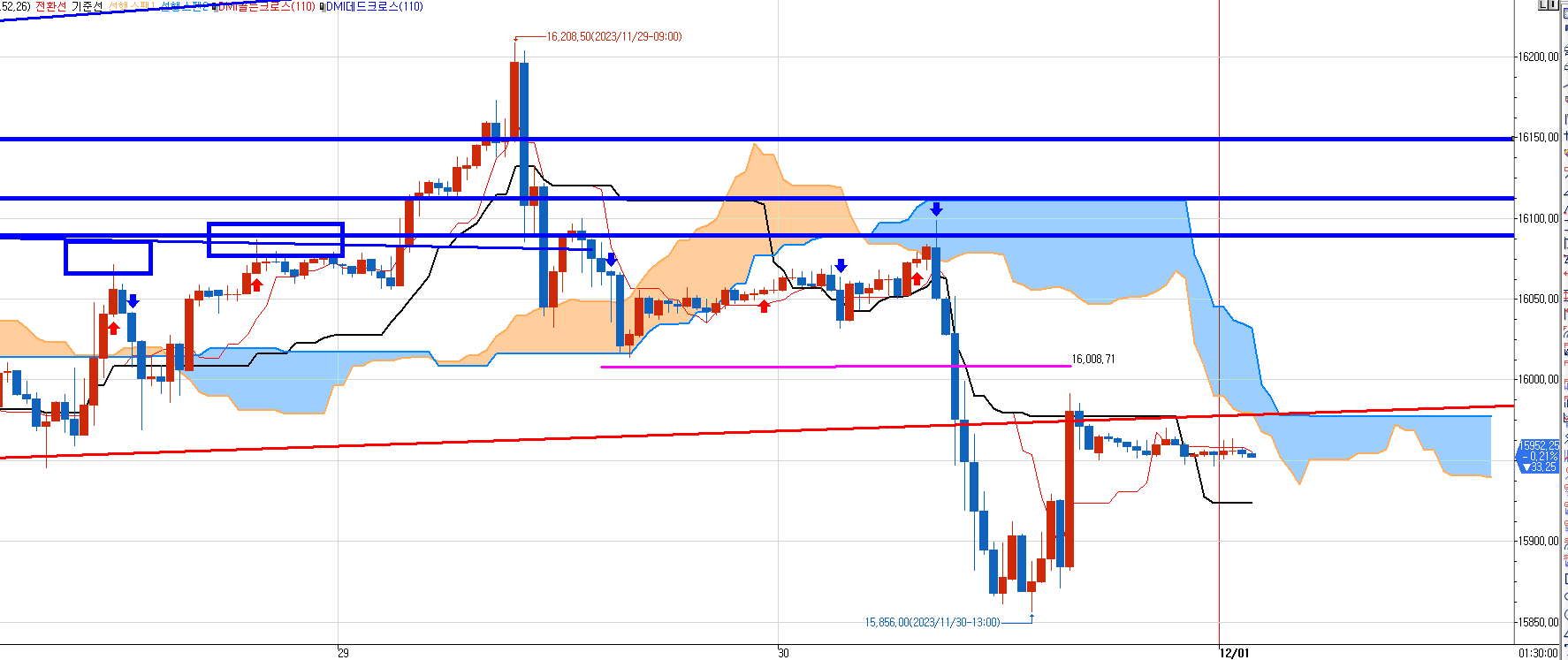 윗 차트를 보면 초록색 동그라미 표시는 11월29일에 매도목표가 15008.50(분홍색선) 을 20틱 덜친 모습니다.