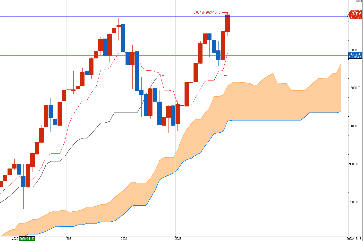 나스닥 월봉이다. 코로나 위기 위후 쳐올렸던 최고점 16767.50을 돌파했다.