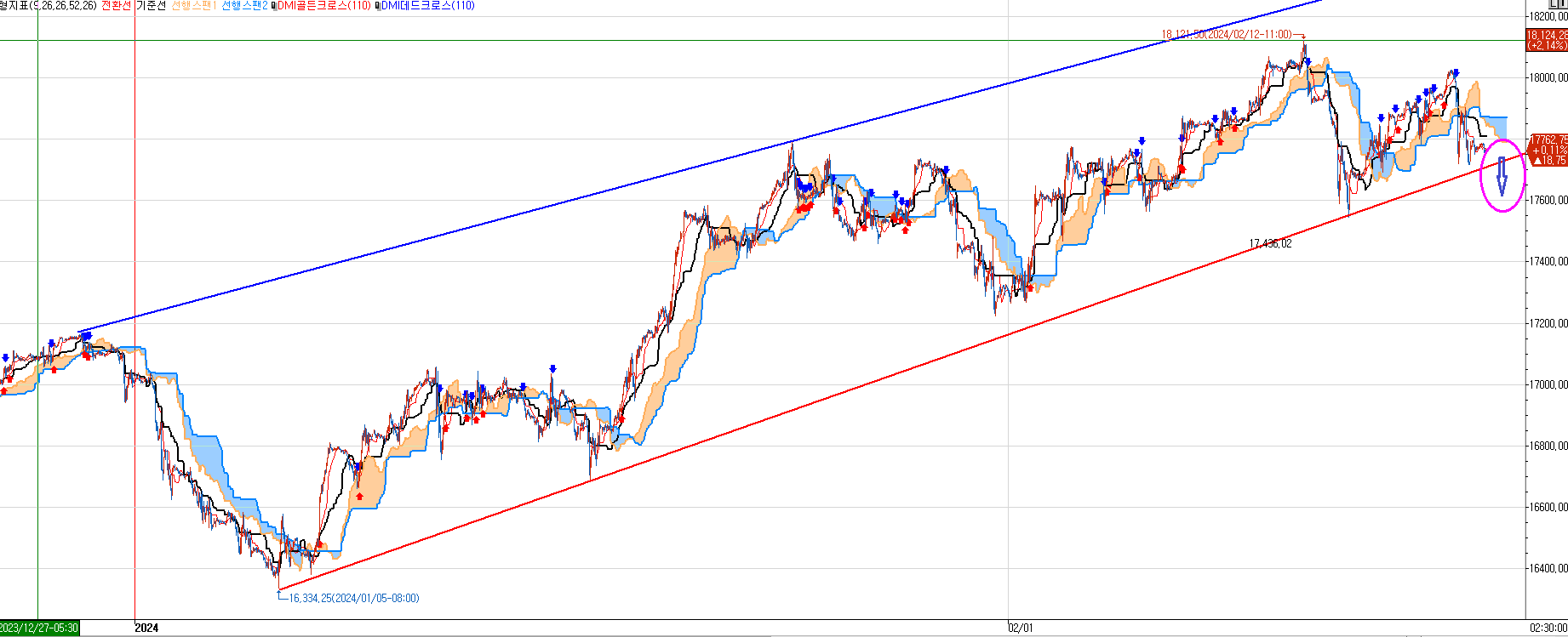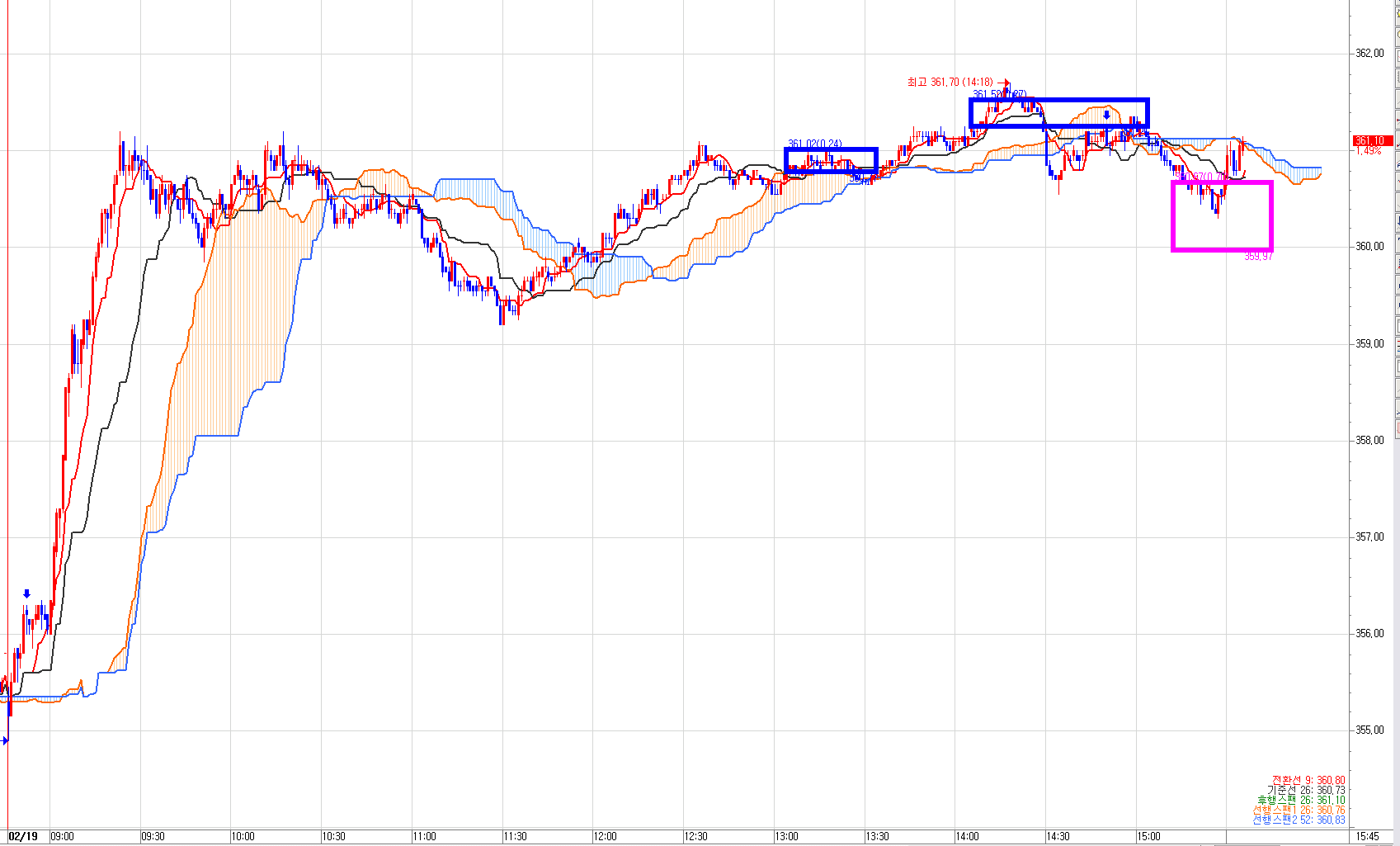 오늘 윗 파란박스에서 분할 매도 24개 진입하였다.