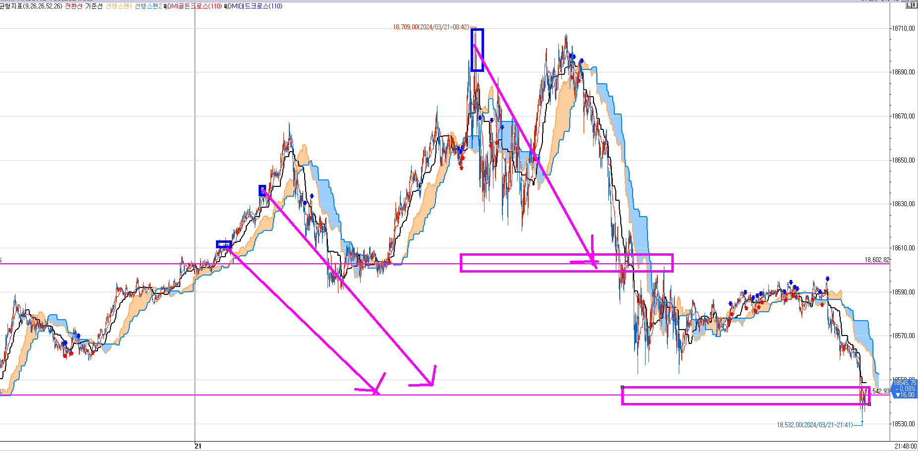 24시간 걸렸네... 일목균형표 1분봉에 발생한 최종 매도 목표가 먹는데 걸린 시간~