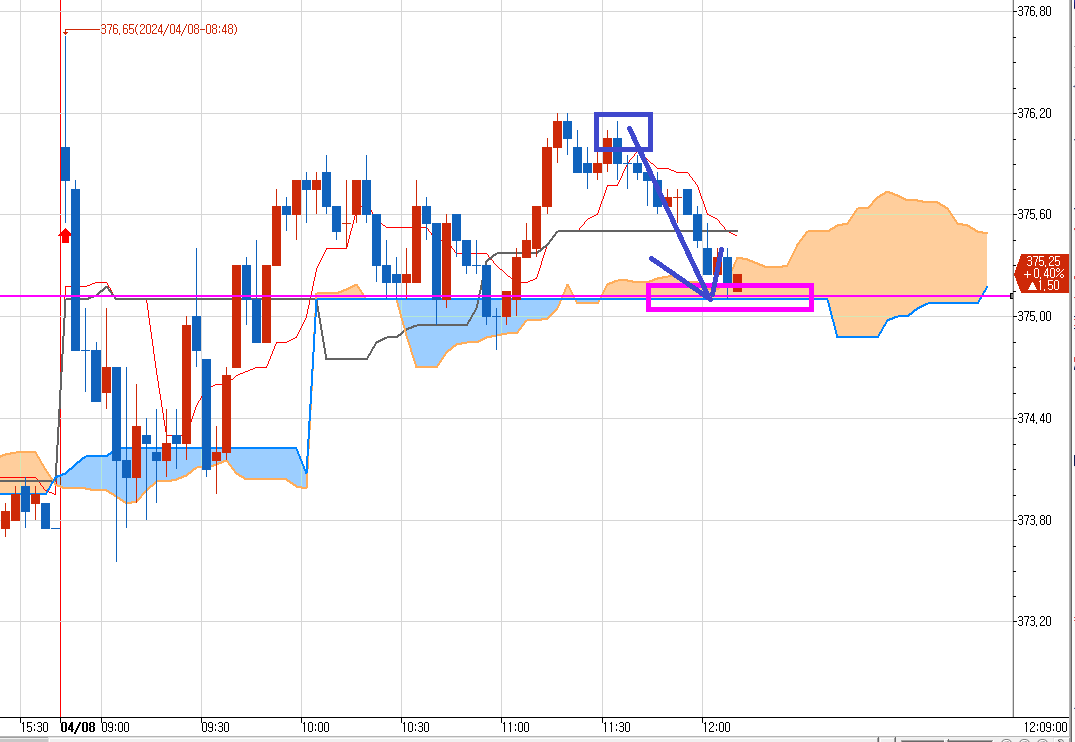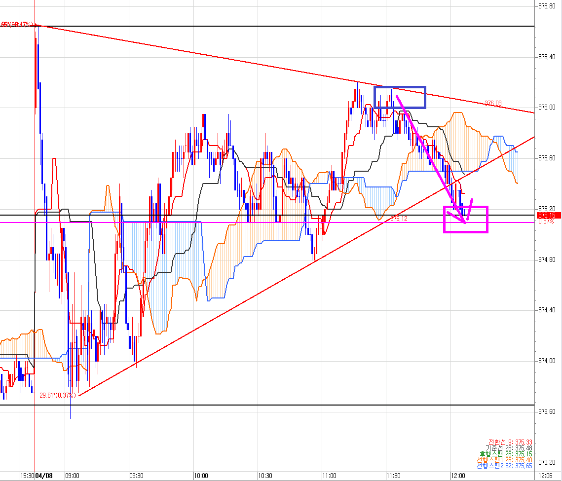일목균형표 3분봉에 매도 목표가가 발생했다. 밑에 분홍색선 375.10이 최종 매도 목표가다.