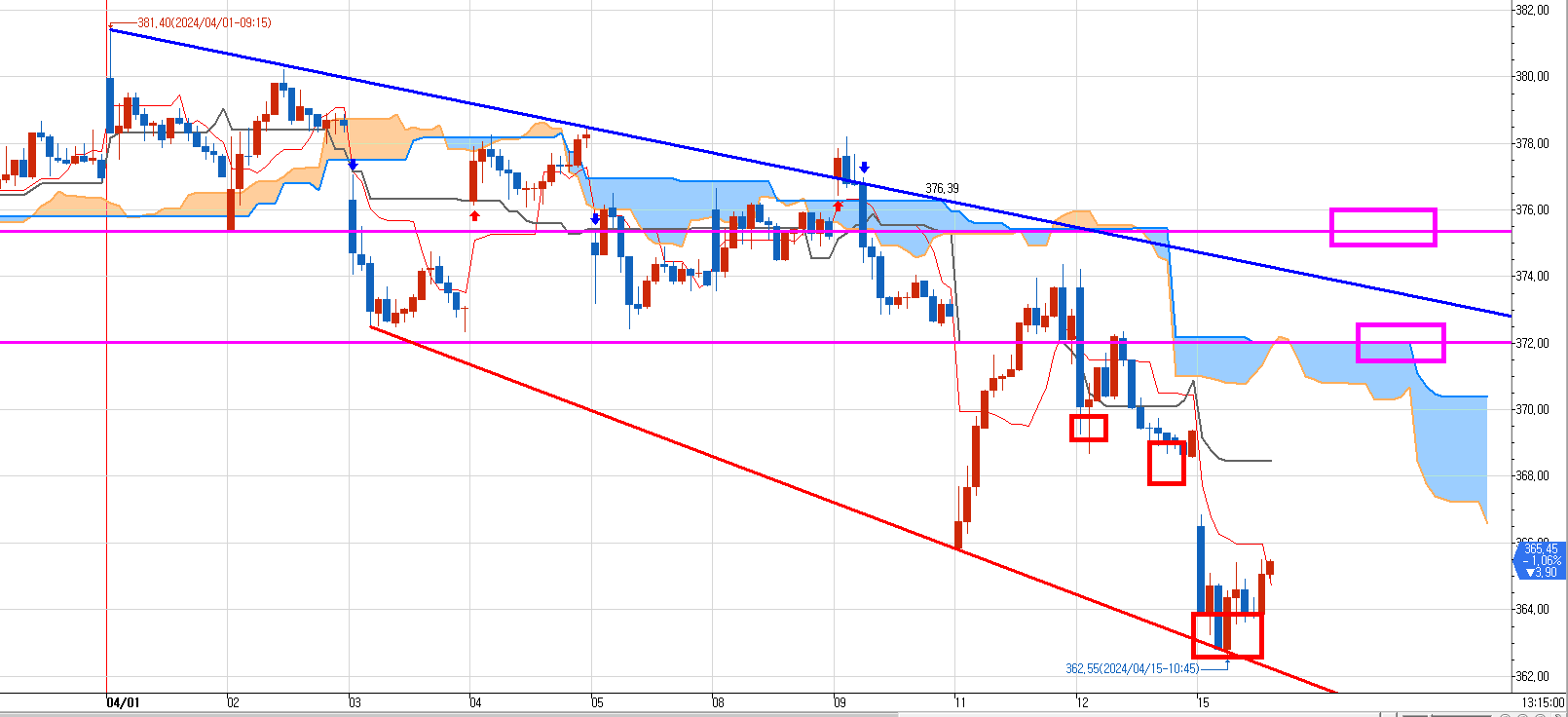 일목균형표 30분봉에서 발생한 국내선물 매수 목표가 372.00은 시간이 좀 걸릴것이다.