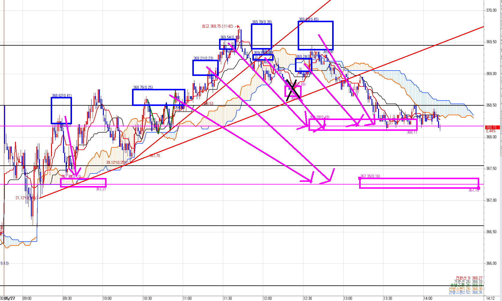 이건 6개는 368.00~05에 팔고, 최종 매도 목표가 아래 분홍색선 367.25 부근에 나머지 10개 올 청산 예정.