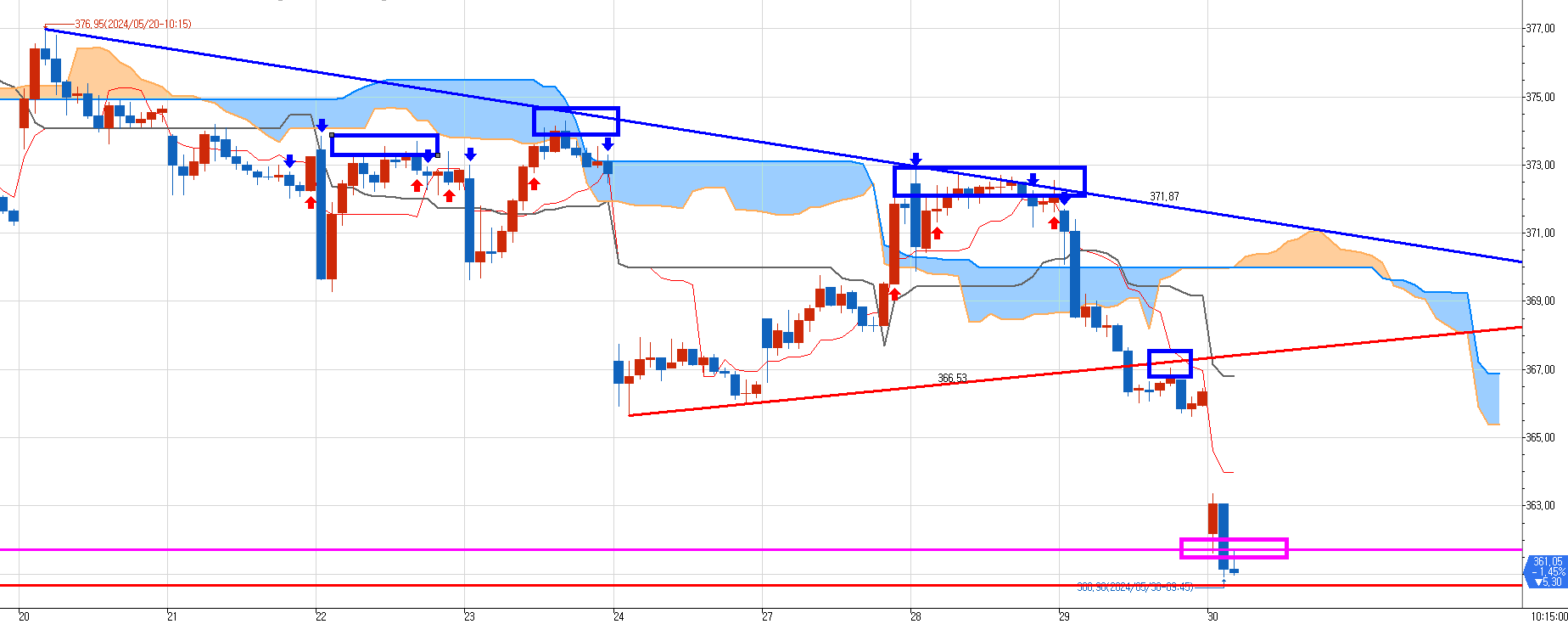 만약 아래 빨간색선 360.70이 봉으로 깨지면 더 내려간다~