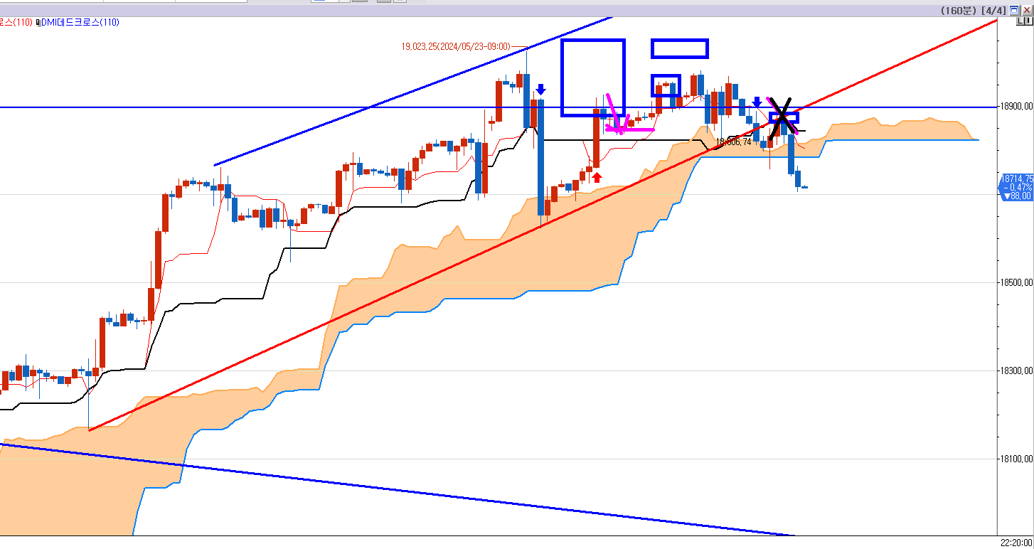 어젯밤 빨간 지지선 깨진것 봤으면 X표 파란박스에서 왕창 10개 더 매도 잡았어야 했는데...