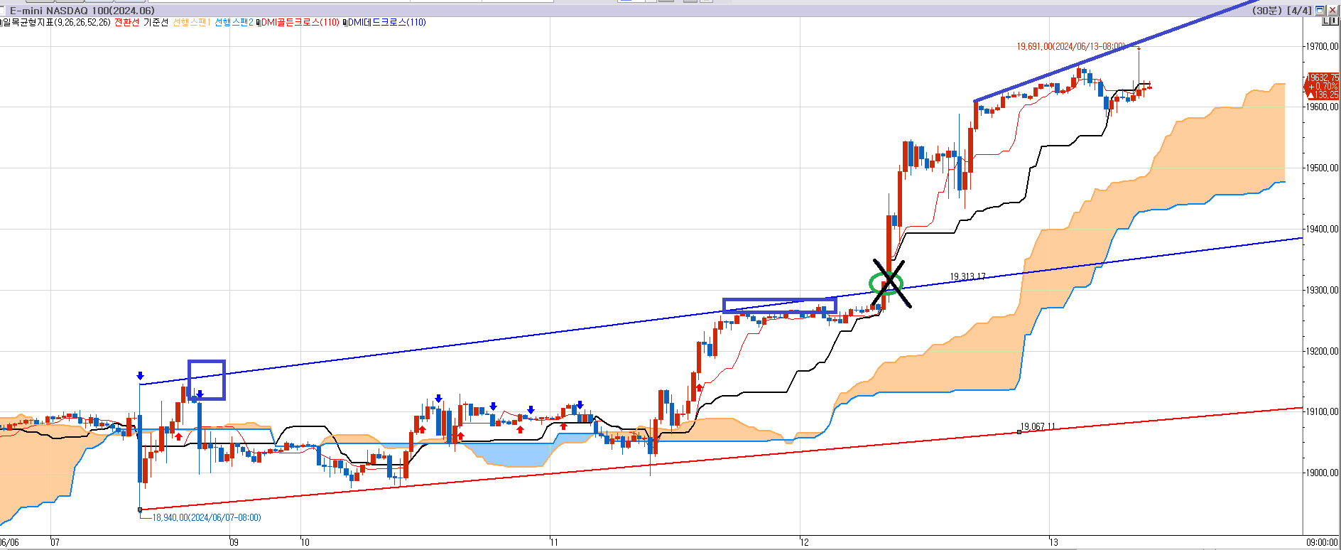 파란색 저항선 올라탈때 나스닥은 손절 주었다. (X표시 구간)