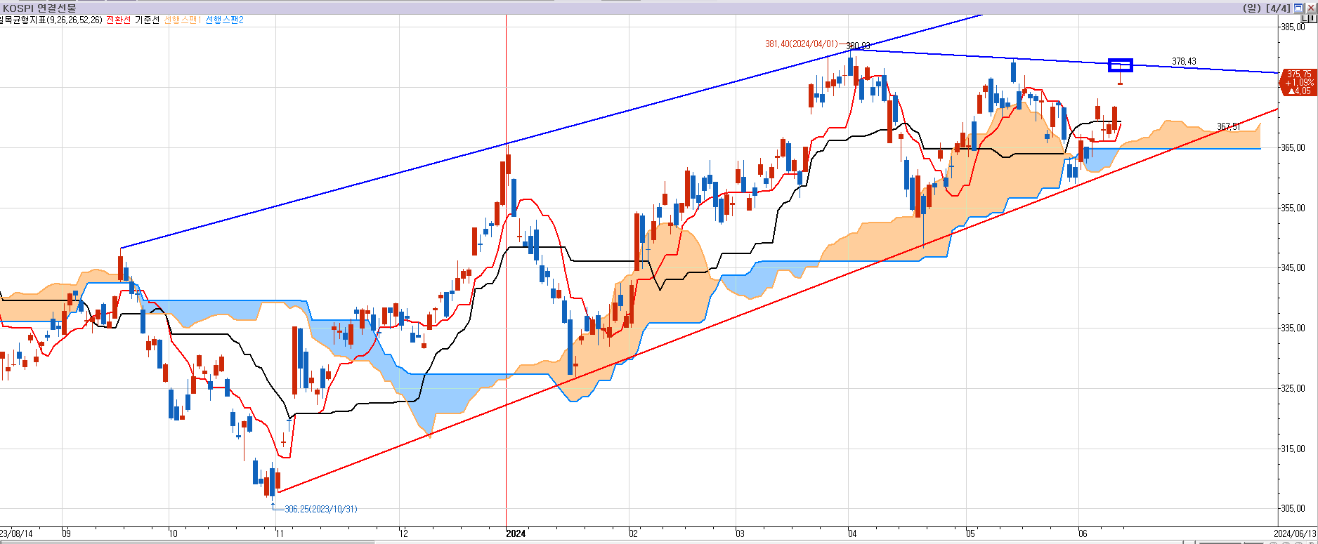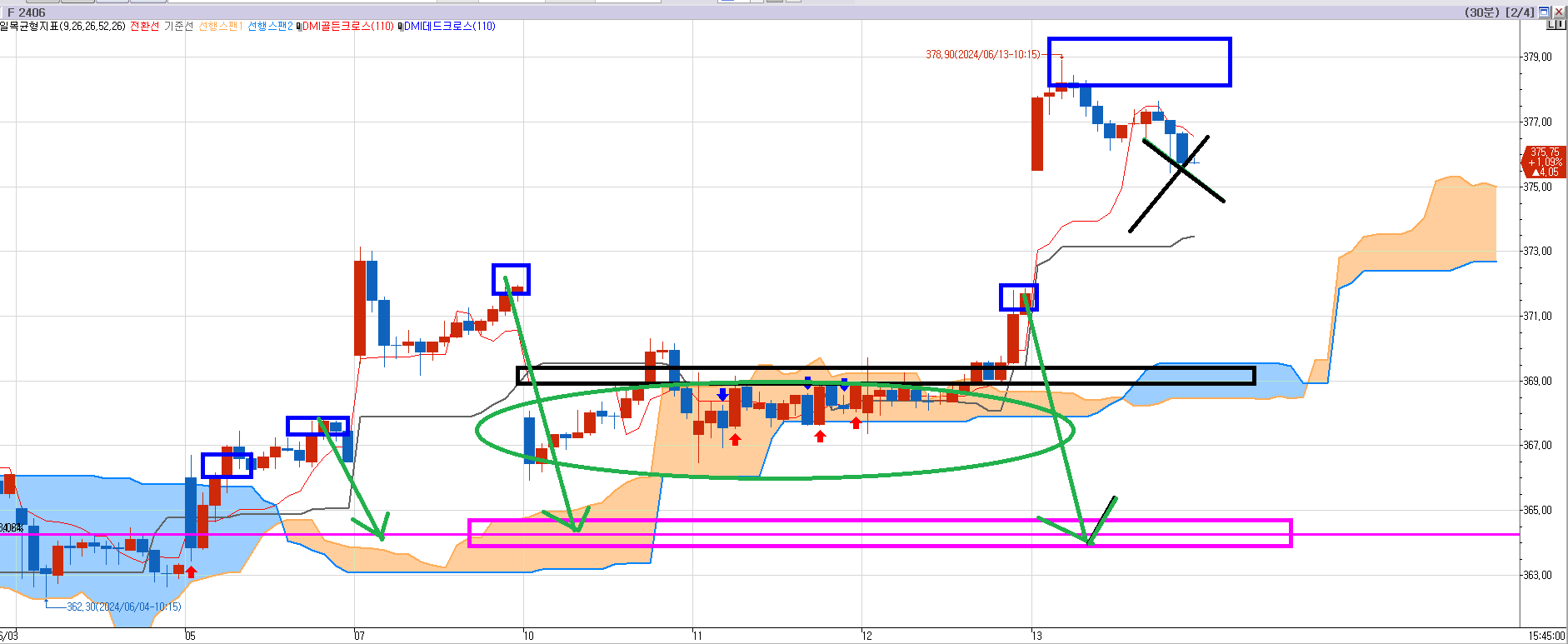 모든 것이 하방을 가리키고 있었으나.. 6월 만기인 오늘까지 매도 목표가 364.25는 안 찍었다.