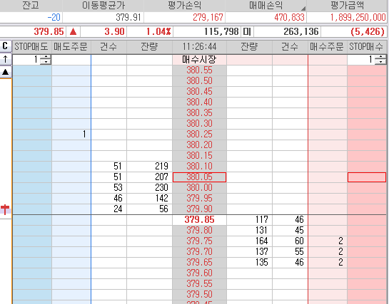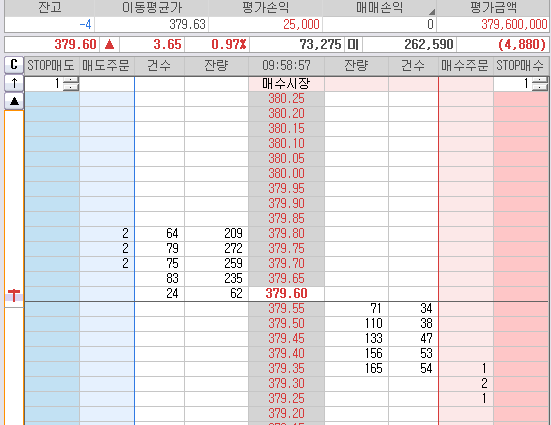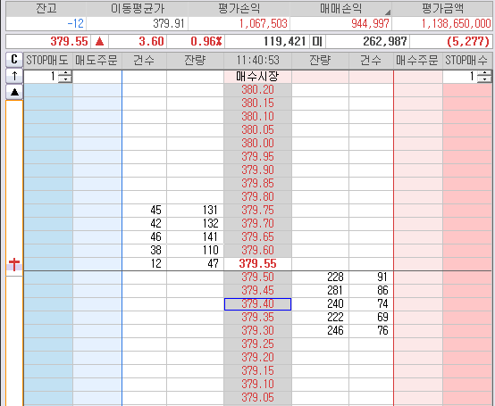 젠장~ 1틱 차이로 안 팔렸다. 그리고 다시 튀는데... 379.75를 양봉을 뚫었다.