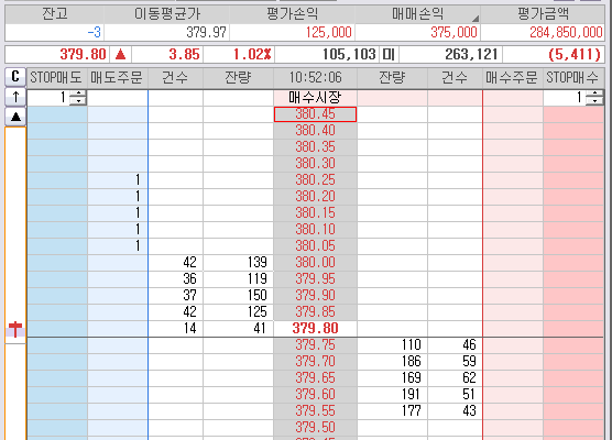 오늘장 시초 10분간 진폭은 378.70 에서 379.75 였다.