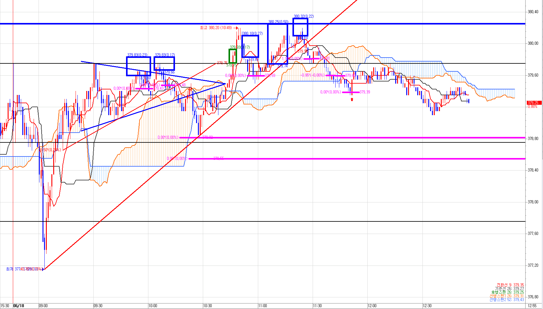 내가 오늘 아침장 부터 그어놓은 379.75를 양봉을 뚫었다.