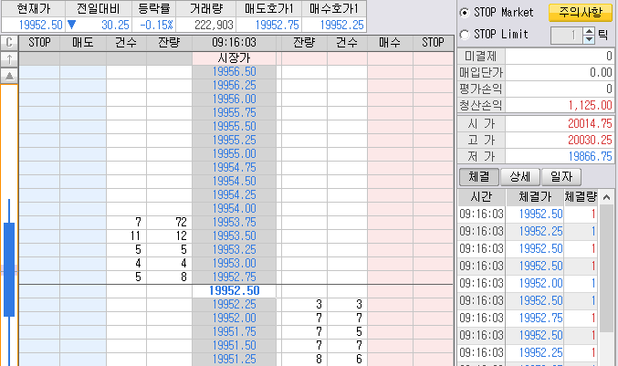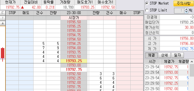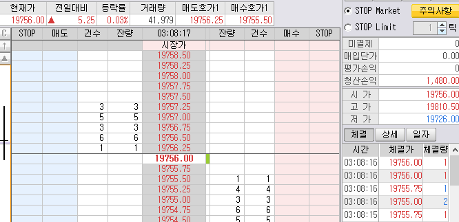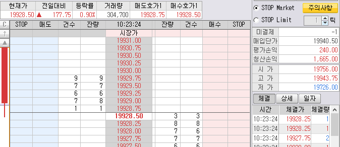 매도목표가 19952는 나스닥 틱차트에 발생한 목표가다. 무조건 찍는 단타 매도 목표가.