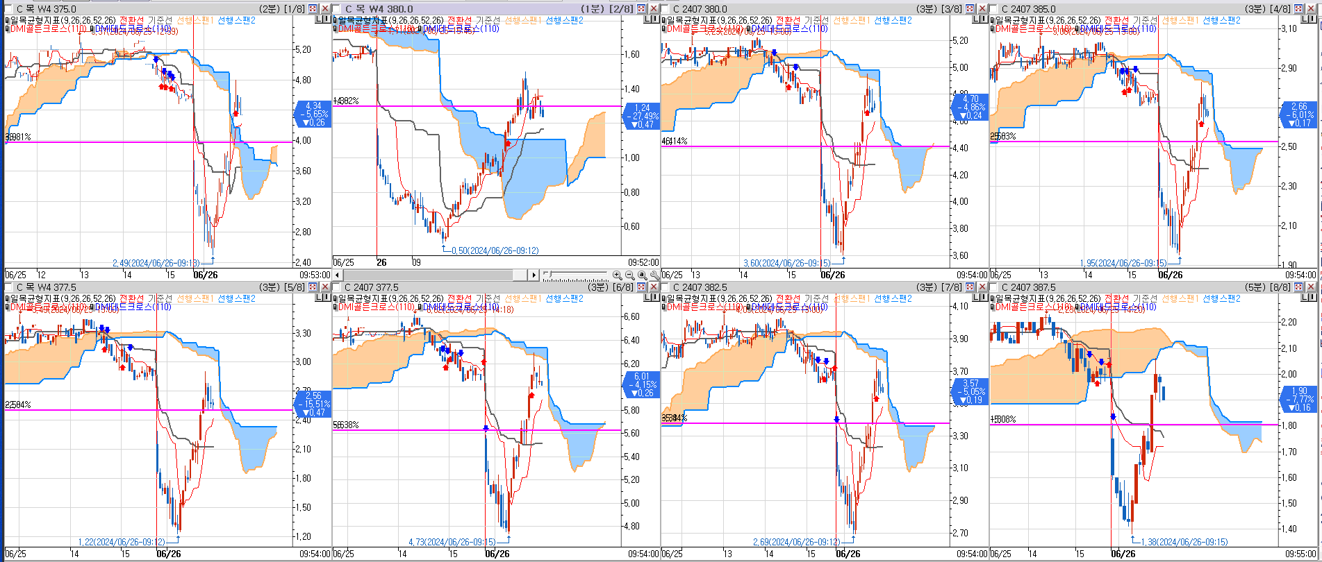 어제 모든 콜옵션 (7월물 콜옵션, 6월 네째주 목요일 만기 위클리 콜옵션)들이 아래 분홍색선을 찍는다고